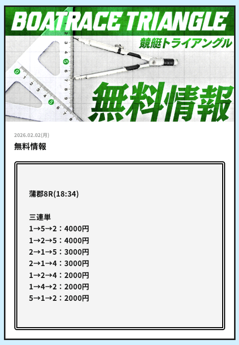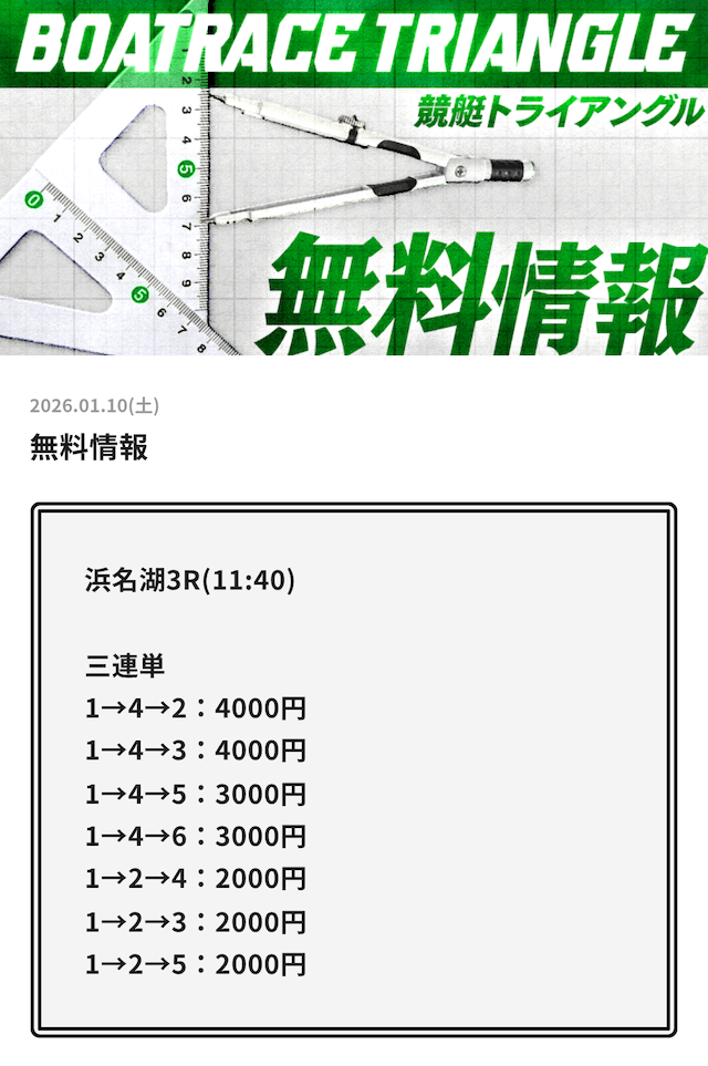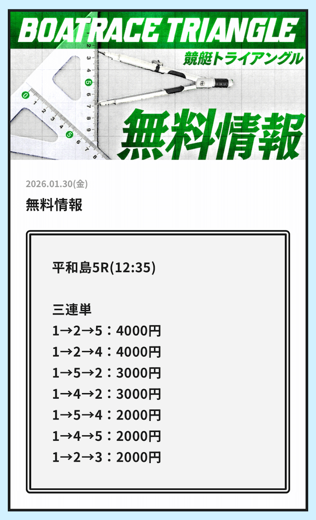 ということで、競艇トライアングルが公開する予想に参加して、当たるのか検証していこうと思います。