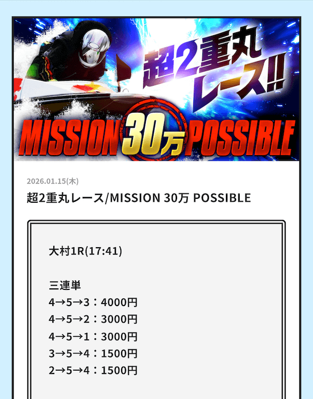 無料予想で軍資金が10万円ほど貯まれば次のステップとして、有料予想の最安値プラン「超2重丸レース」に参加しましょう。このプランは15,000円で購入可能で、最大30万円ほどの払い戻しに期待できます。