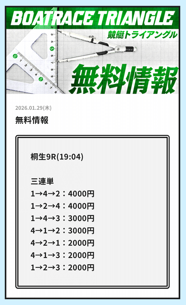 匿名無料予想、毎日参加してますが記事の通り多摩川競艇場の時は鉄板です。回収率400%超えは伊達じゃない。自分の予想だとガミるようなレースでも、トライアングルの買い目だとしっかりプラスになるから不思議。投稿日:2026/01/29