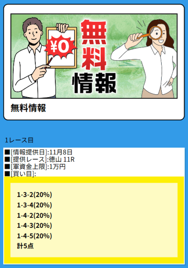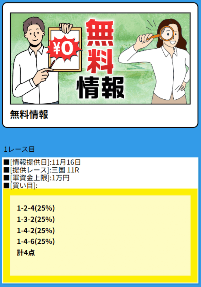 4日連続的中です!しかも無料予想で!これが1日2レース公開されるのは有難すぎる。できれば1日10レースくらい公開してほしいレベル。笑 今後も活用させていただきまーす!