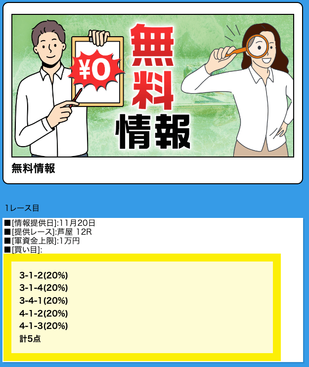 無料予想の実力は本物で、口コミも好評ばかりだったので・・・。