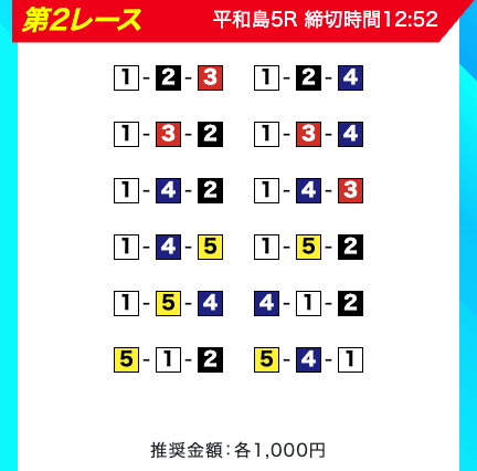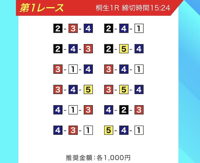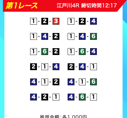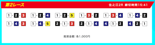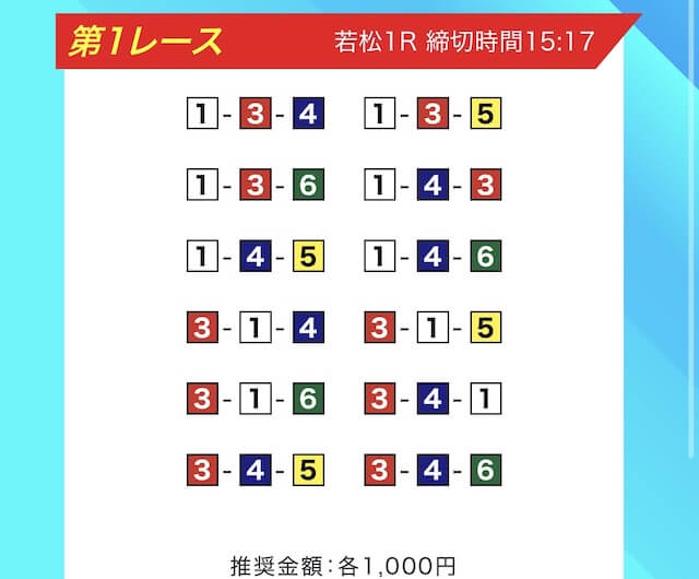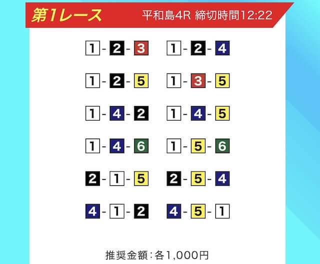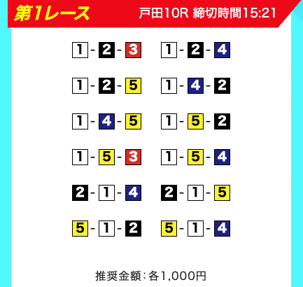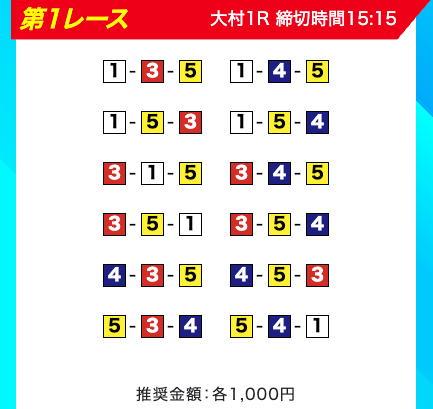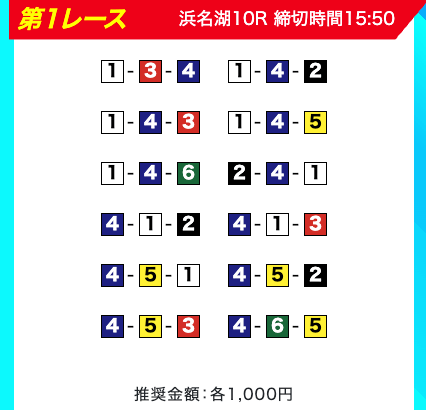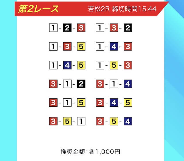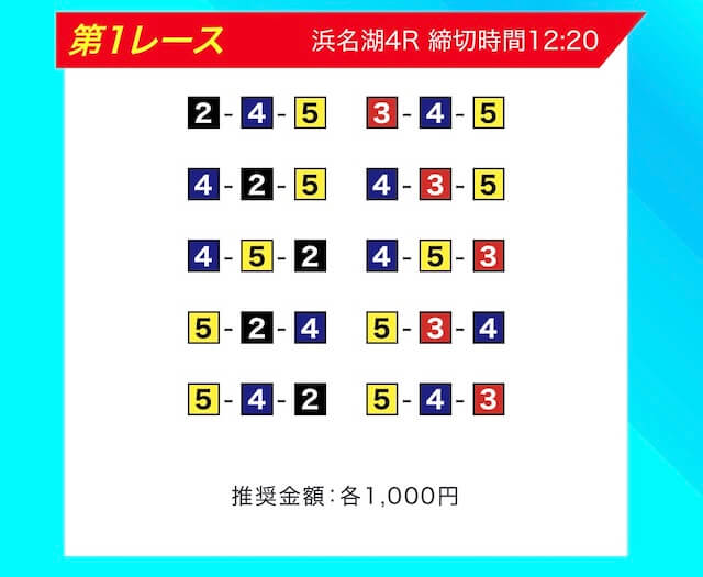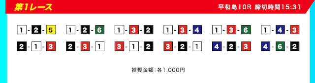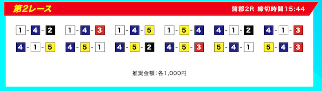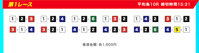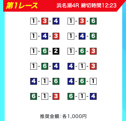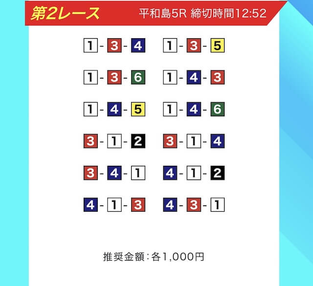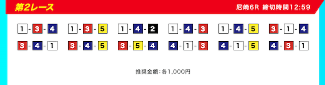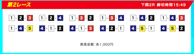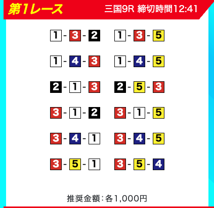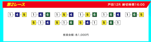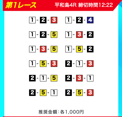 買い目は、①③-①③④-①③④⑤・④-①③-①③と、①③号艇を軸に④⑤号艇を絡める組み合わせ。