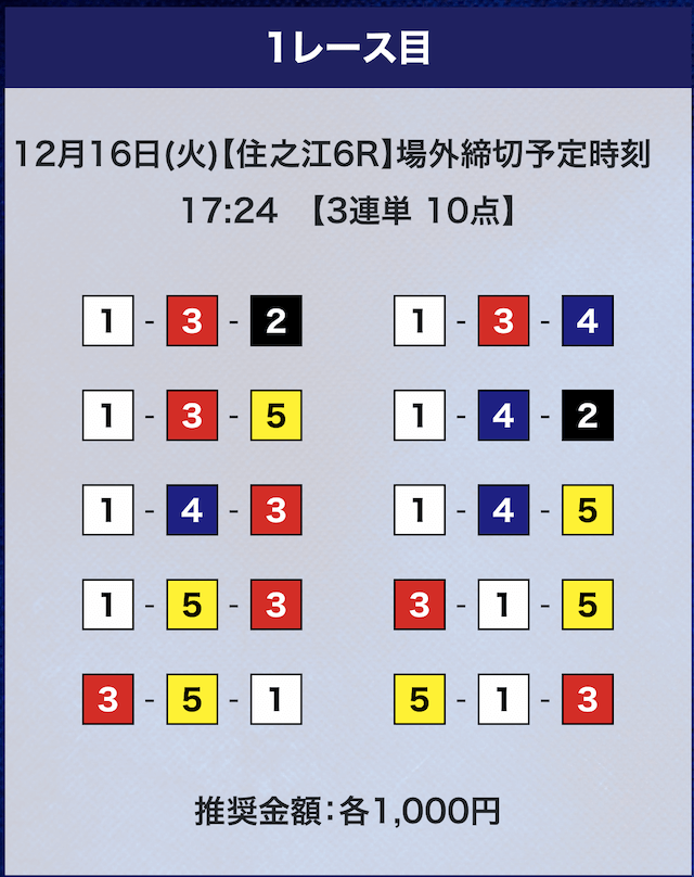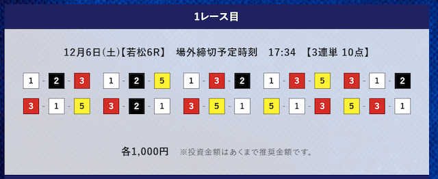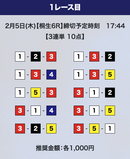 買い目は①-③⑤-③④⑤、③-①⑤-①④⑤、⑤-①③-①③と、①③⑤を信頼する形。