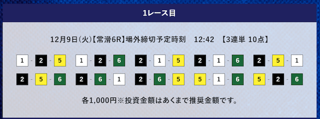 買い目は①-⑥-④⑤、④-①⑤=⑥、⑥-①④-①④、⑥-④⑤-④⑤と、①④⑥号艇を軸に⑤号艇を絡める組み合わせ。