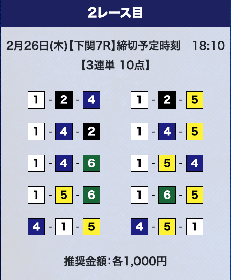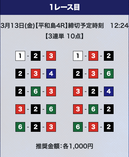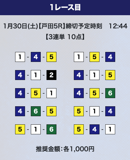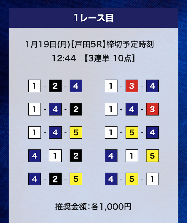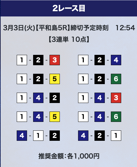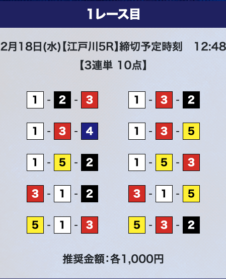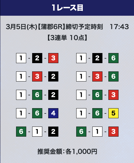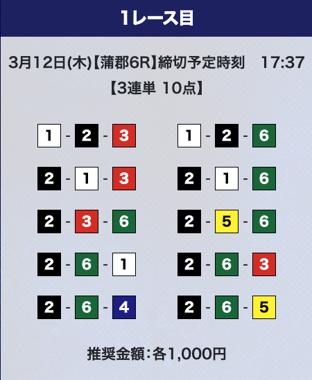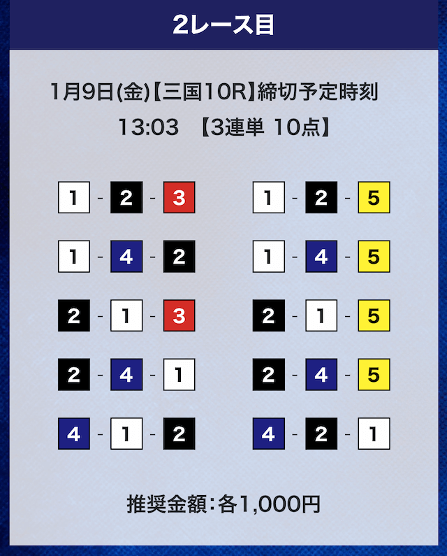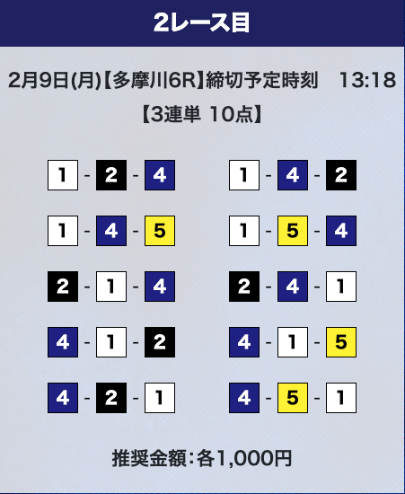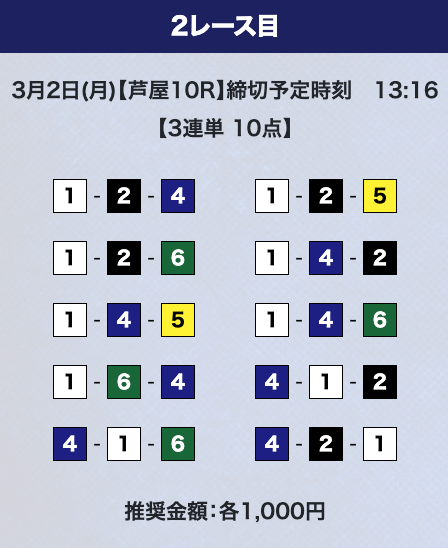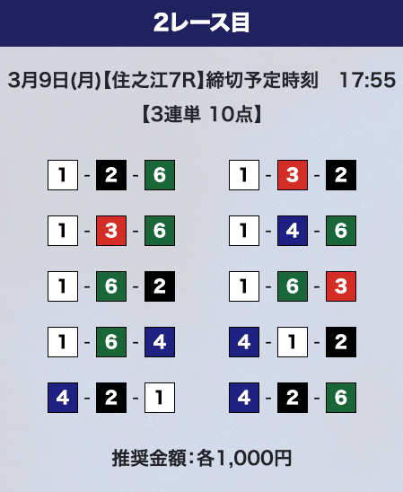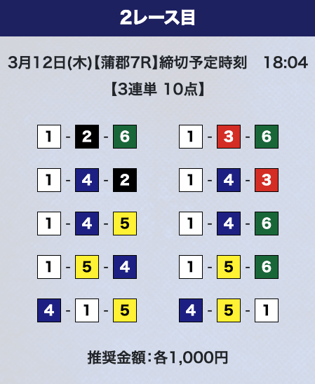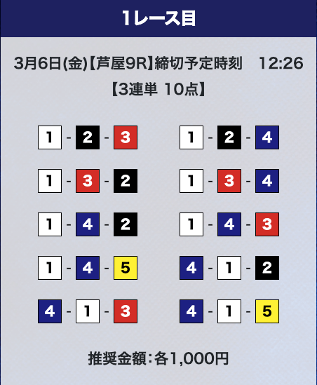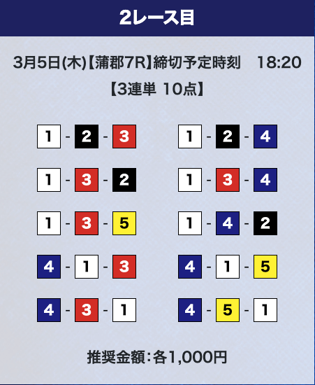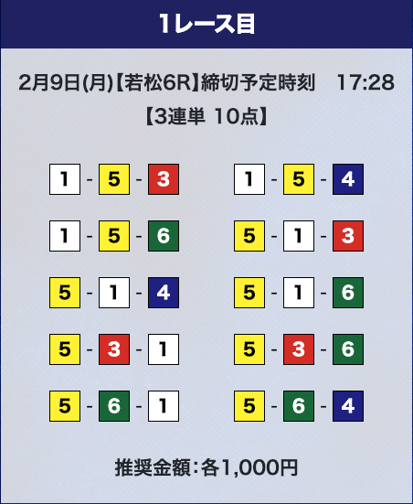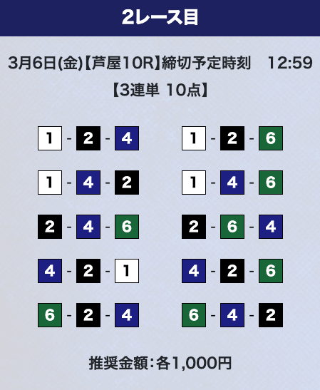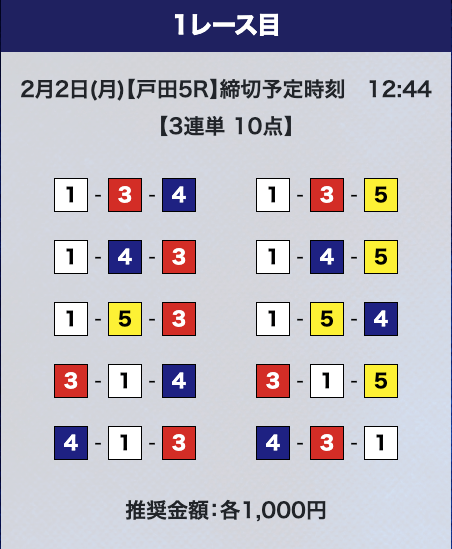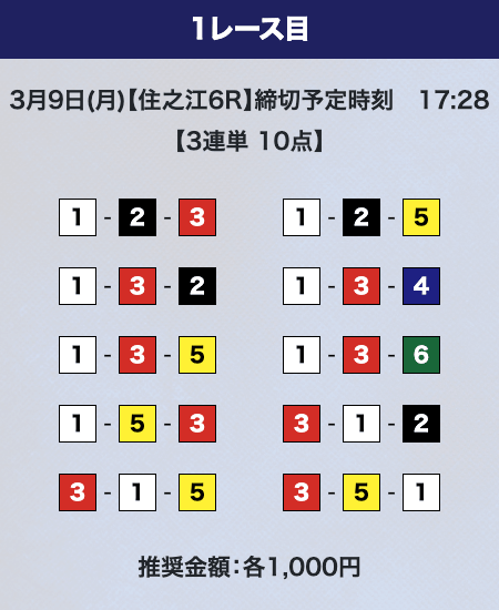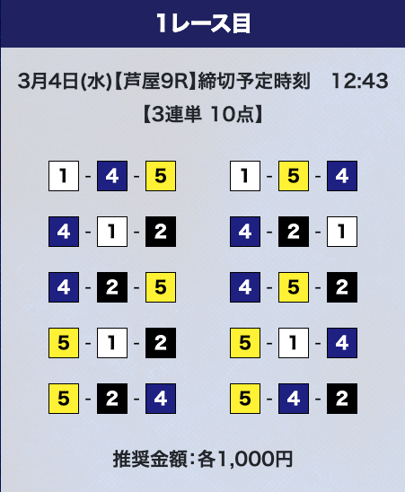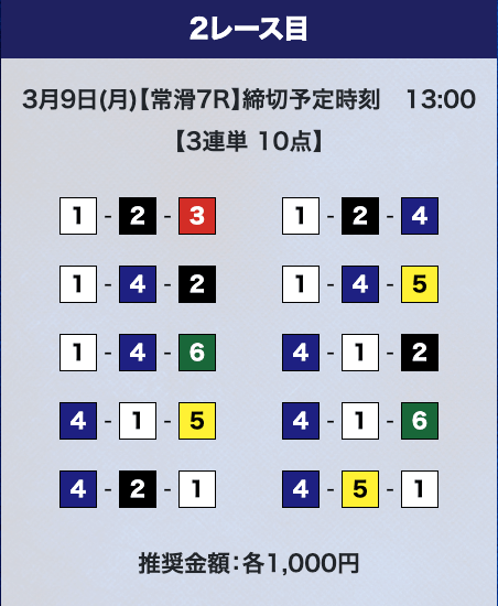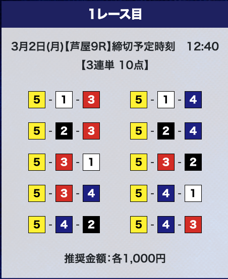 - 推奨舟券代:計10,000円(1点1,000円)