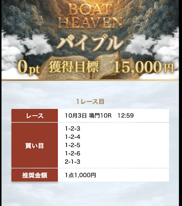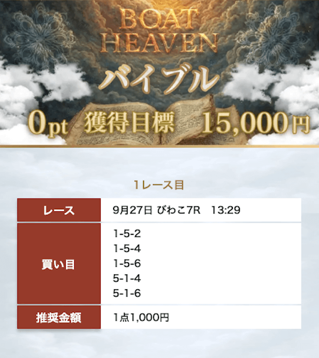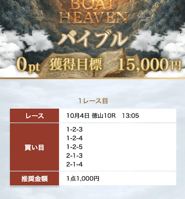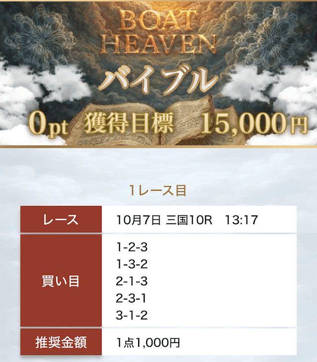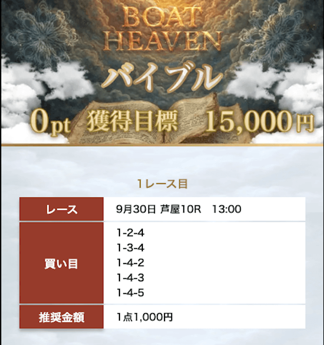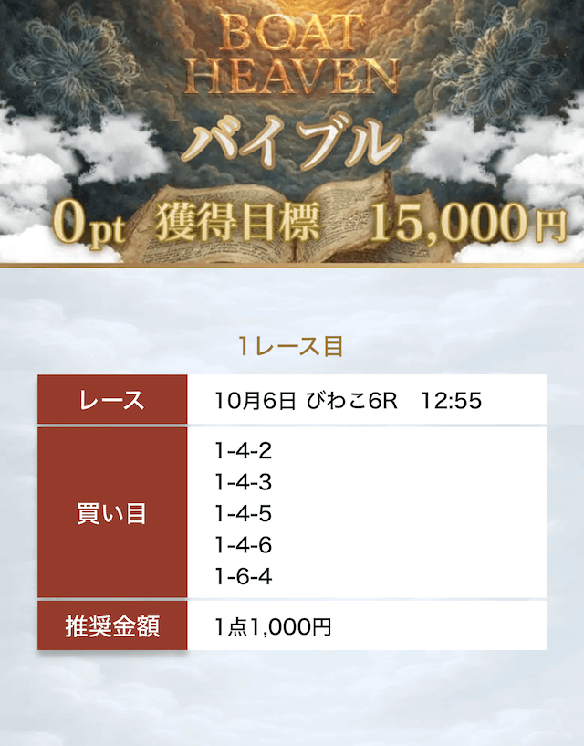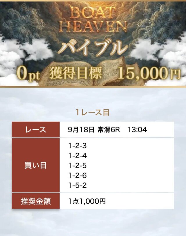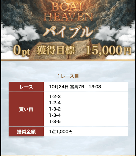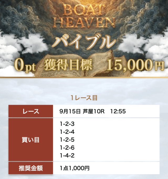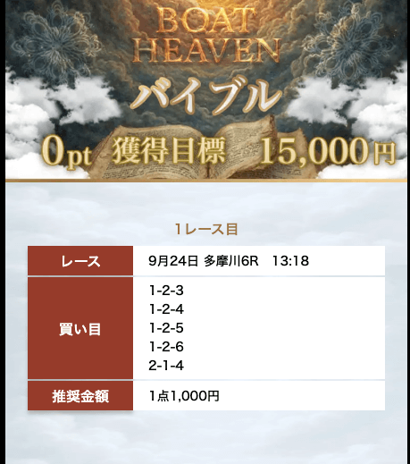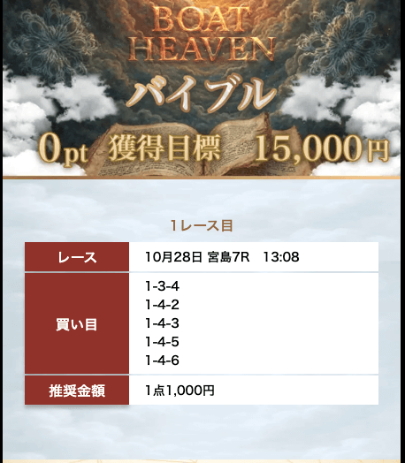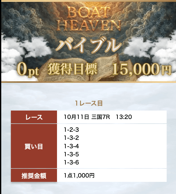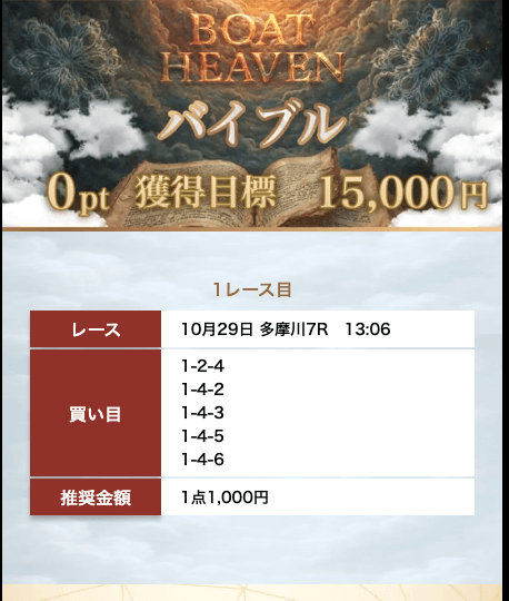 -  ボートヘブンは軍資金が少なくても大勝ちできる体制?が整っています。自分がスタートした時の軍資金は3万円。そこから無料予想→ミラクル→キューピットの流れで参加してき、1週間で40万円をゲット!上手く行き過ぎかな??明日からもこの流れで参加してみるけど、どうなるか。投稿日:2025/07/31