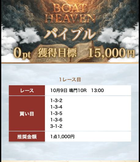 -  先月末から無料予想に参加して10万円のプラス!!基本的には10番人気以内の堅い決着だけど、人気艇を2軸で押さえるから、買い目点数が5点まで抑えられている。だから的中するだけで、回収率がグンと上がる。効率良く稼ぎたいなら「ボートヘブン」一択だと思います。投稿日:2025/07/20