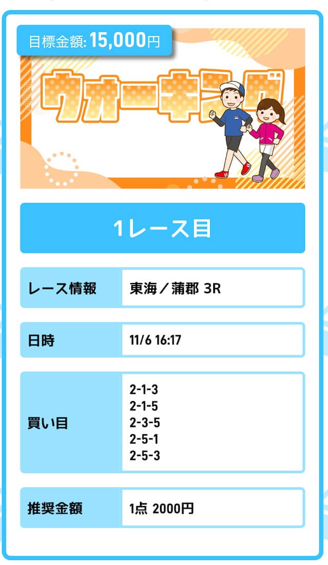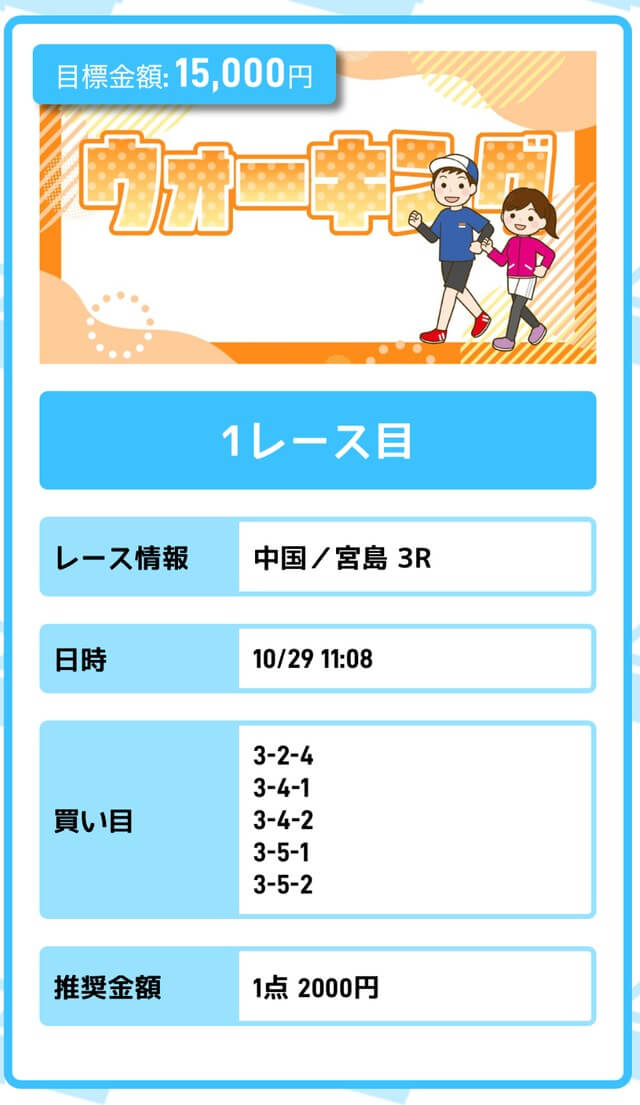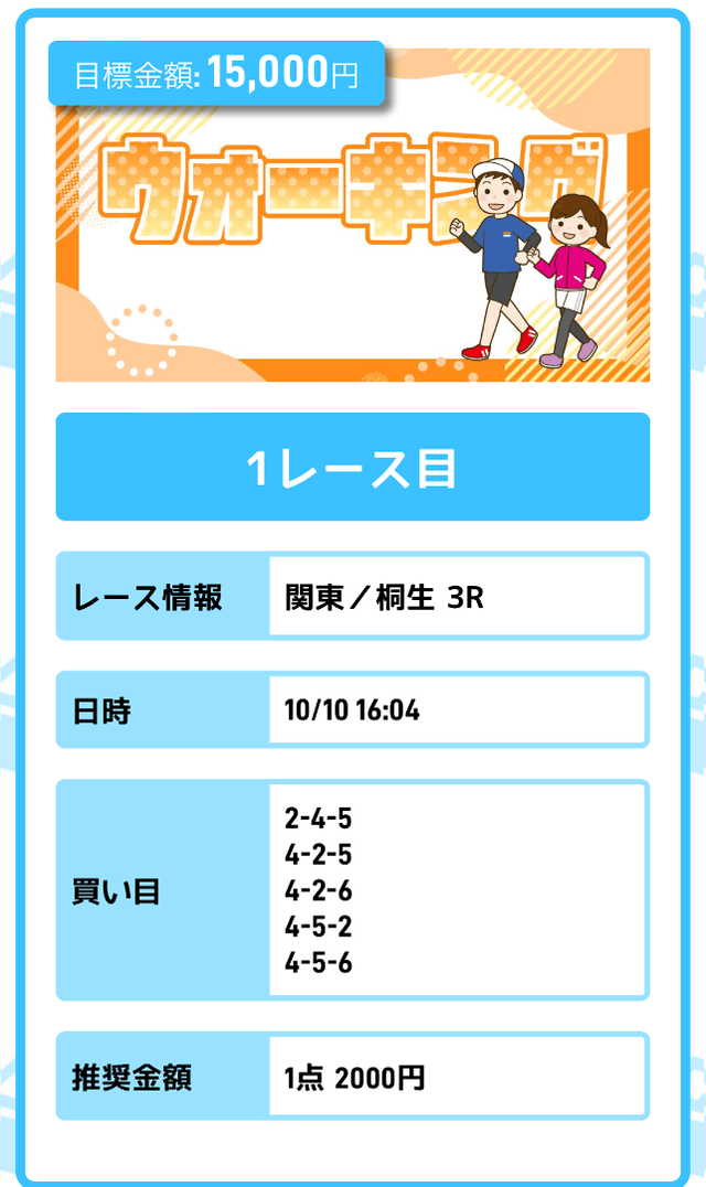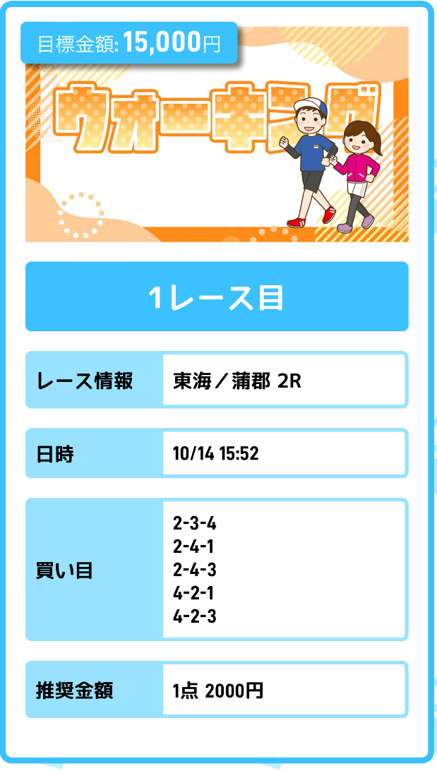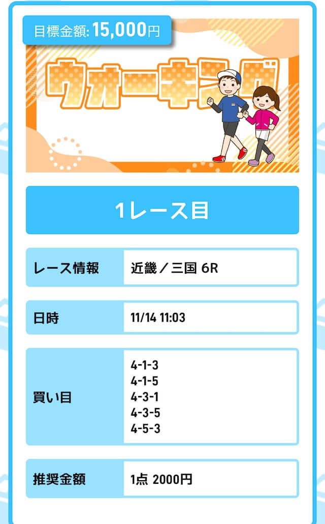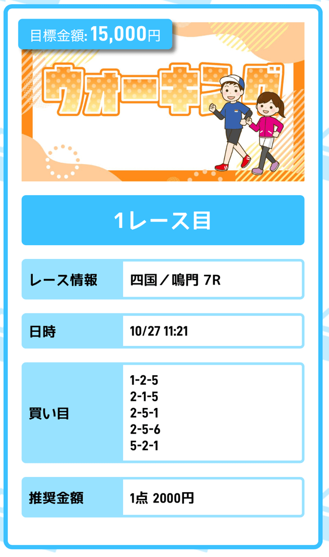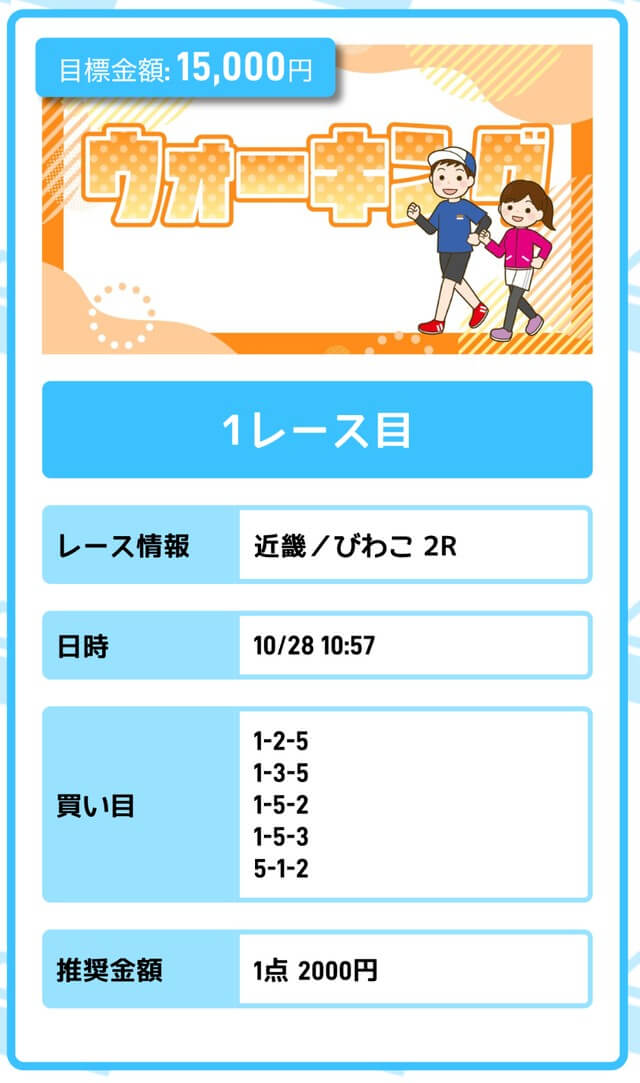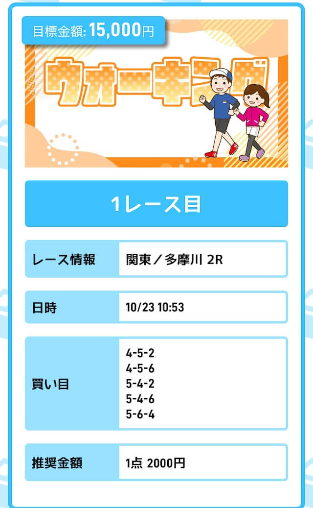 まずは「無料予想」に参加しながら、登録特典(100pt)を使って「ジョギング(80pt)」に挑戦。もし当たれば5万円を一撃で稼ぐことが出来ます。仮に外れても1〜2週間ほど「無料予想」に参加すれば賄えるでしょう。