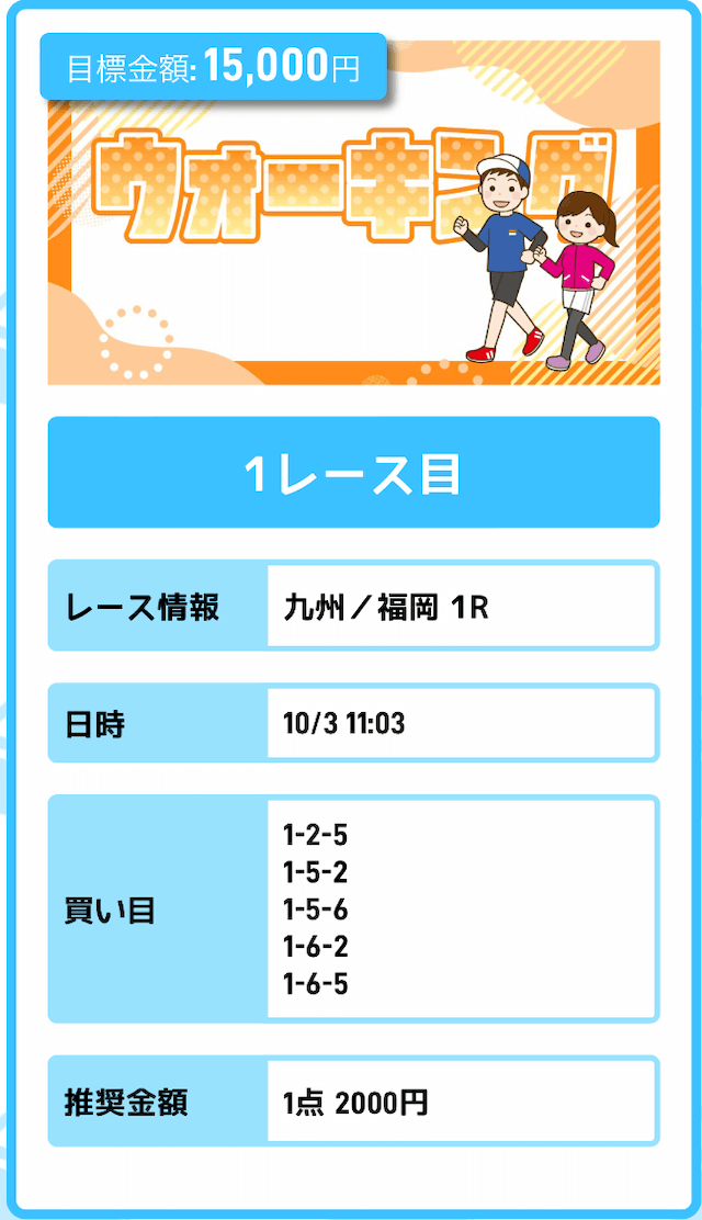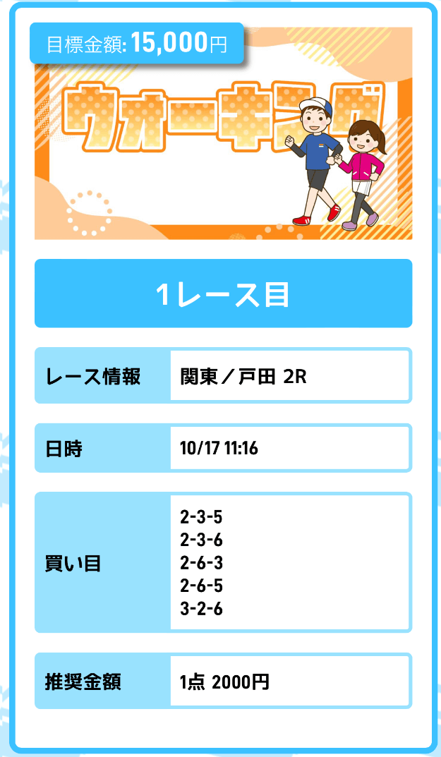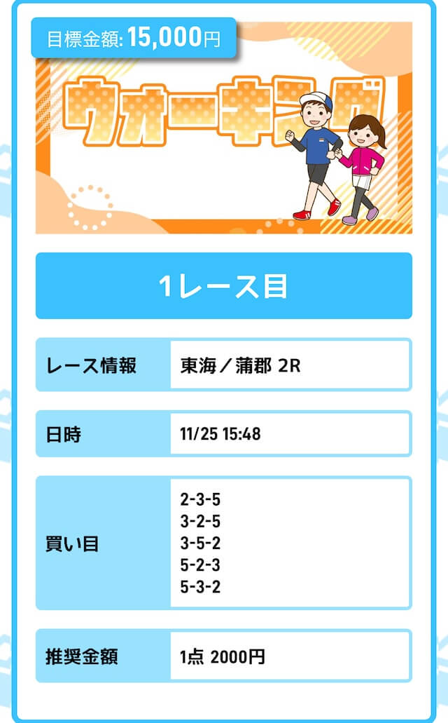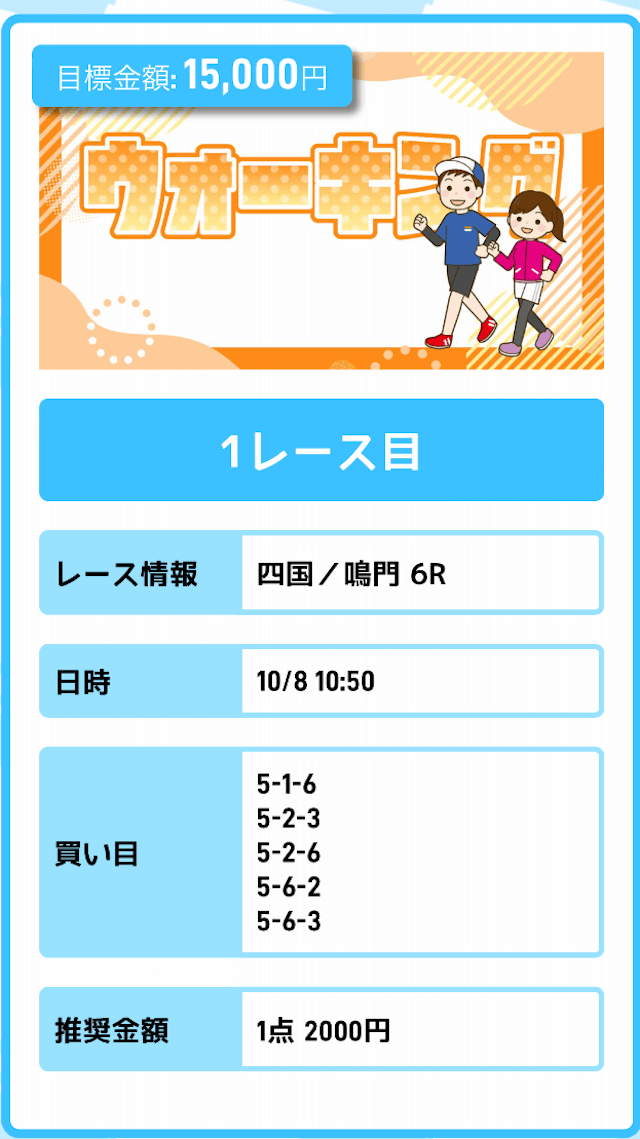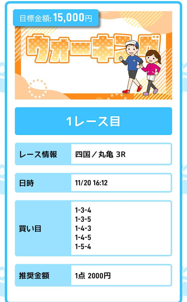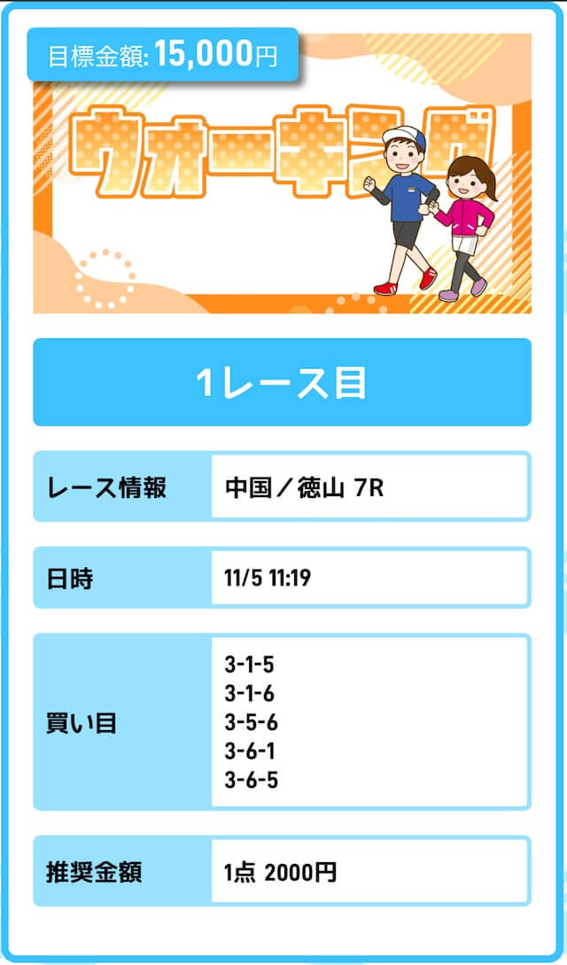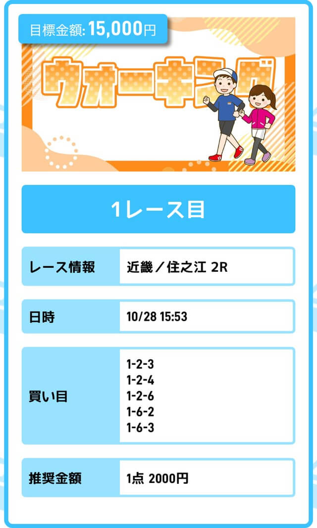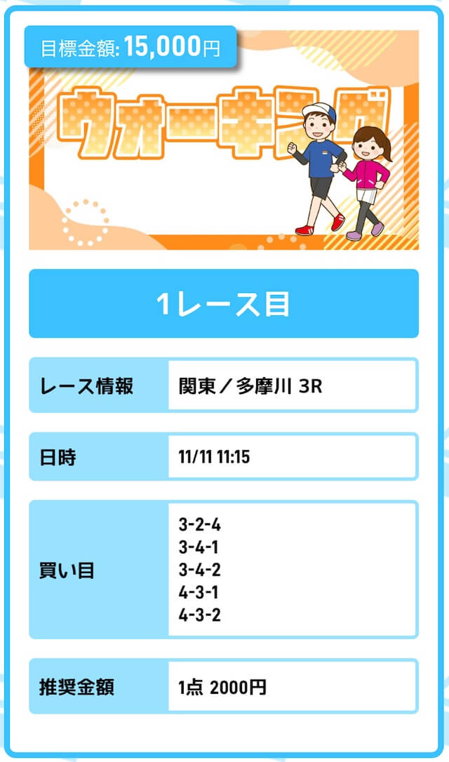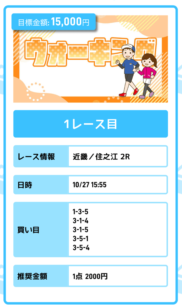 まずは「無料予想」に参加しながら、登録特典(100pt)を使って「ジョギング(80pt)」に挑戦。もし当たれば5万円を一撃で稼ぐことが出来ます。仮に外れても1〜2週間ほど「無料予想」に参加すれば賄えるでしょう。