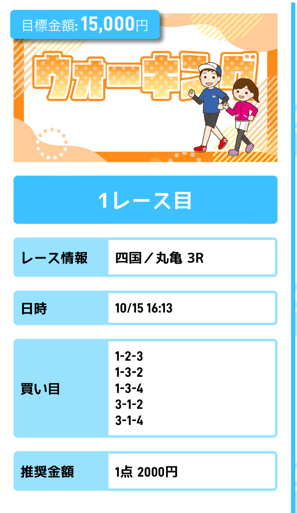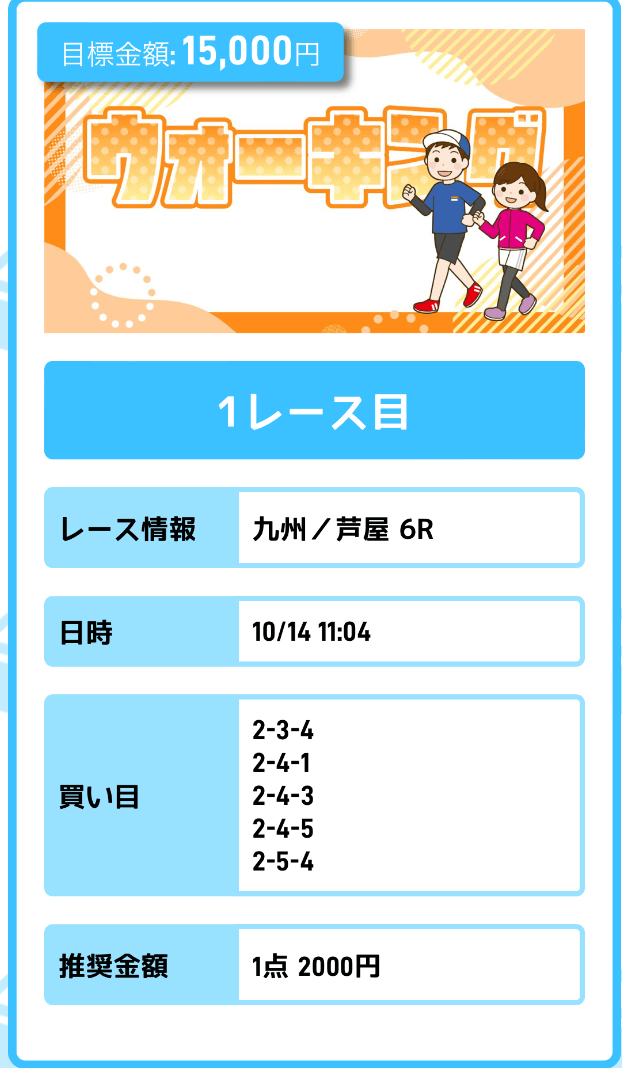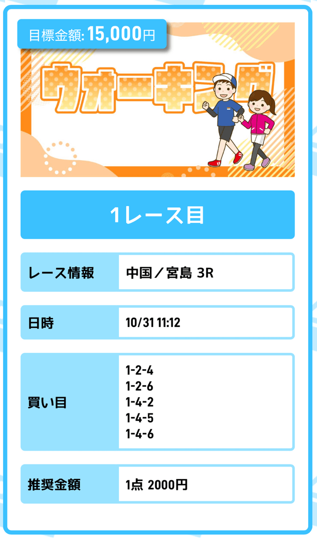 人気どころを中心とした買い目が公開されるんだけど、資金配分が指定されていないから、的中した買い目によって払戻金が大きくブレる。目標金額にも届かないし、なんやこれ。