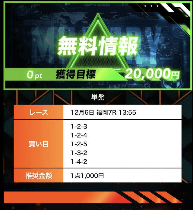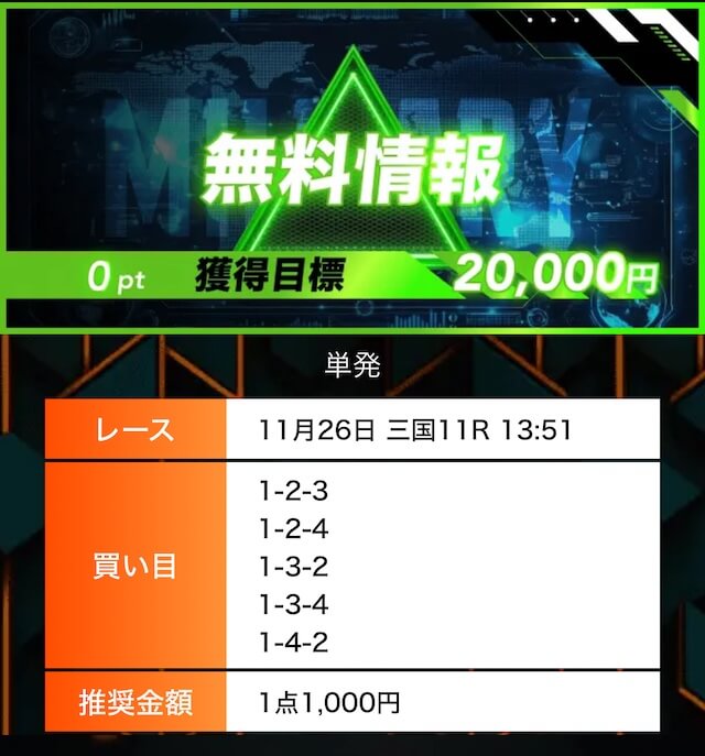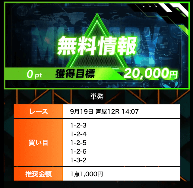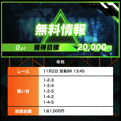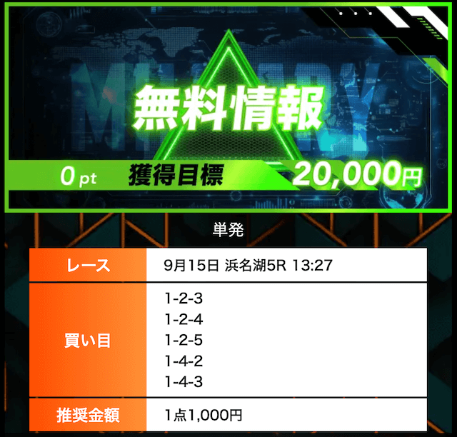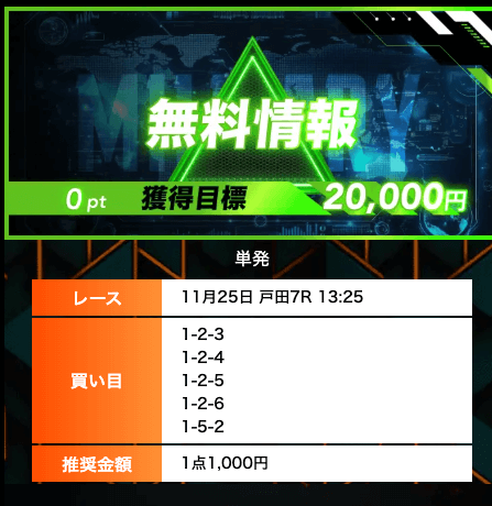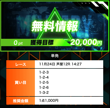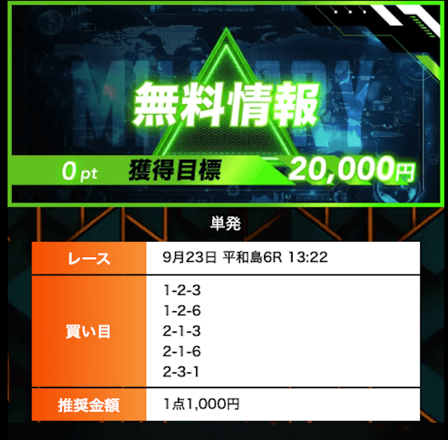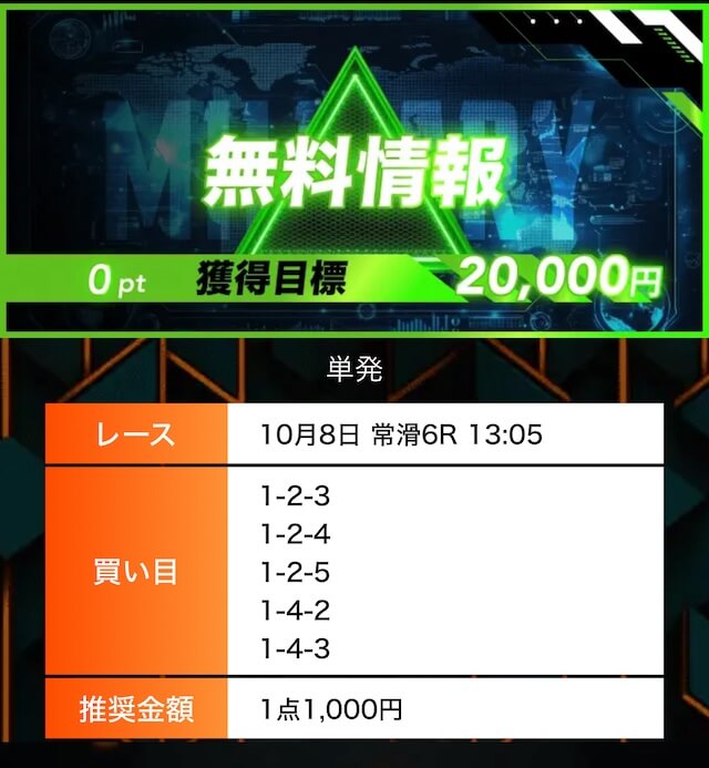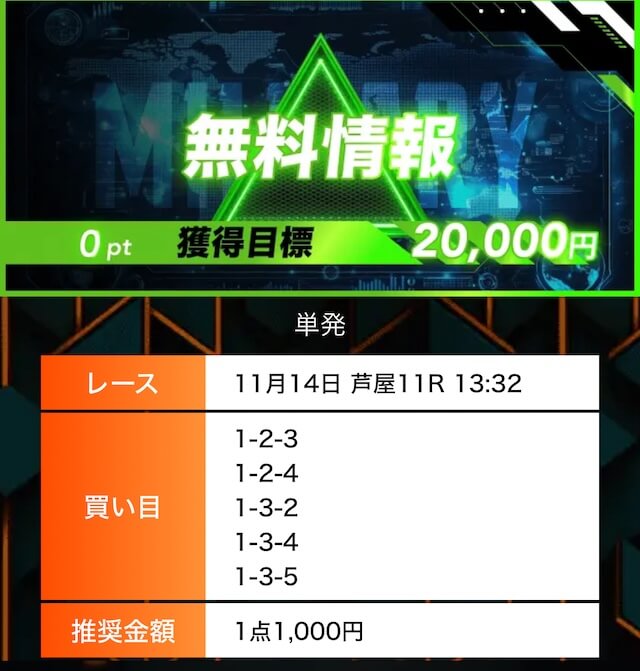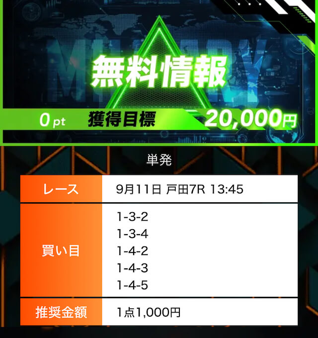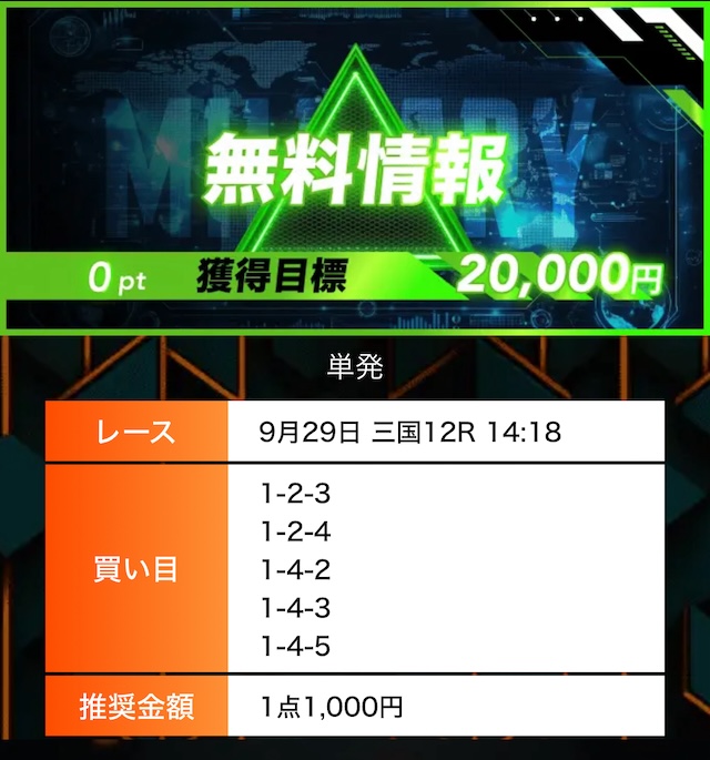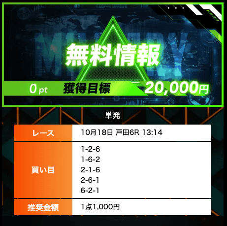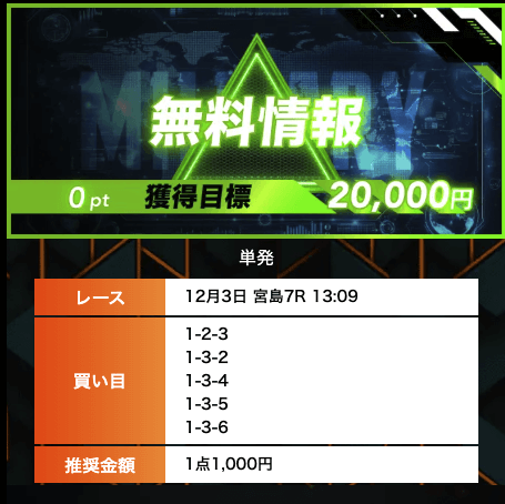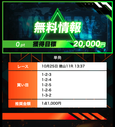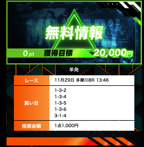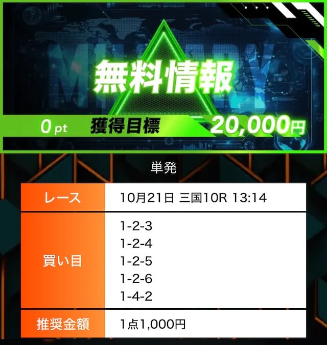 - 有料プランってどこも高い印象だったけど、ここは比較的リーズナブル。特に「登録特典」で参加できる新兵は実質無料みたいなもんでありがたかった。結果はしっかりと的中し4万円ちょっとを獲得できました〜。ぜひお試しあれ!投稿日:2025/09/04