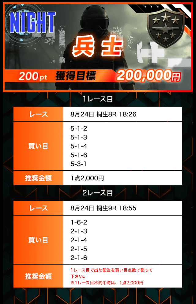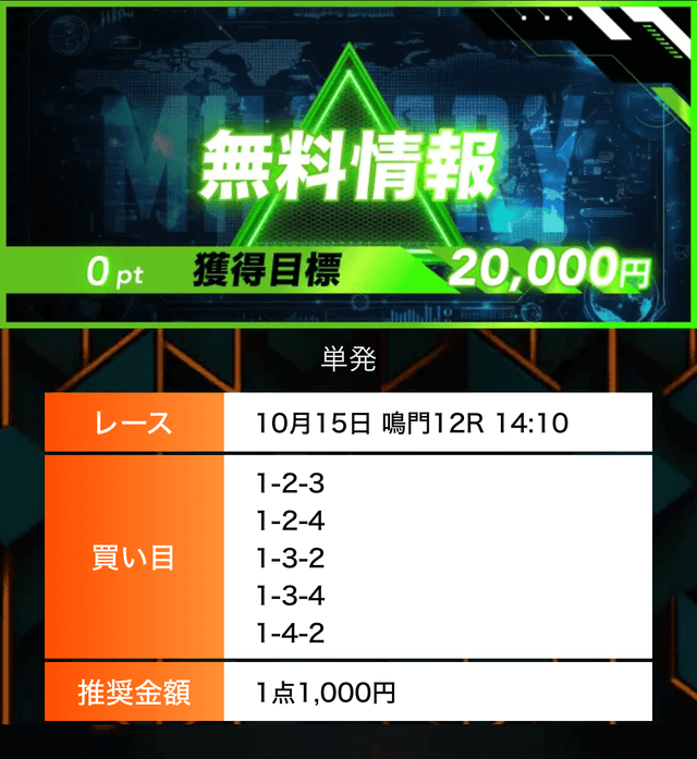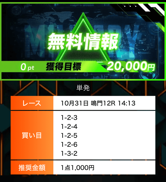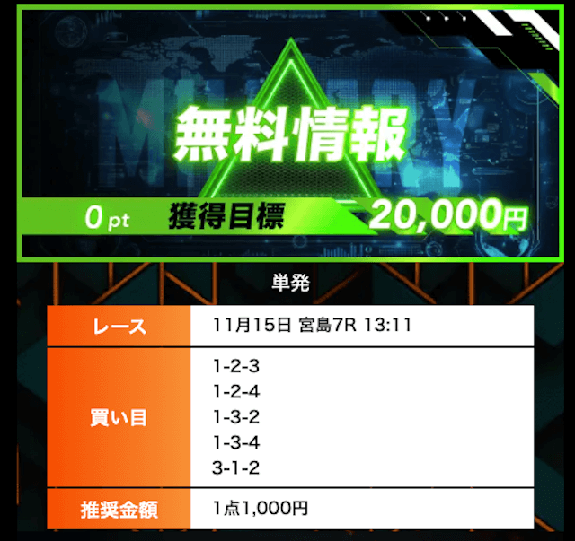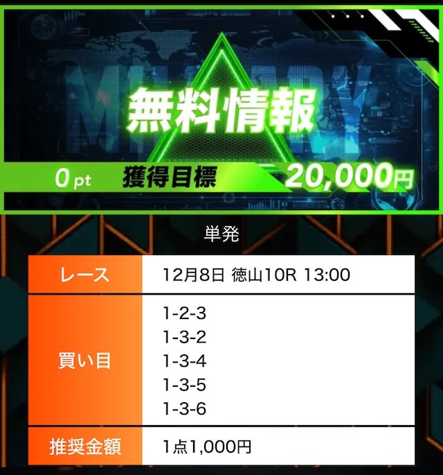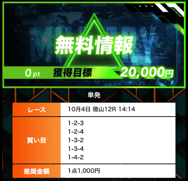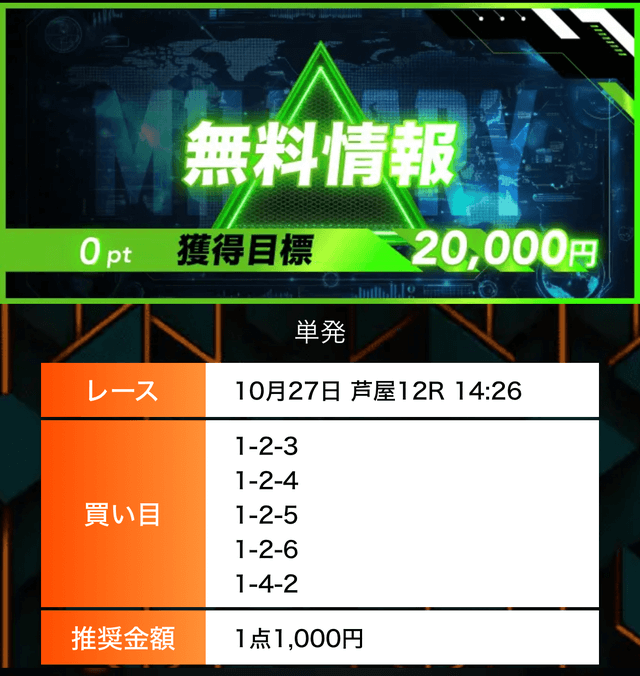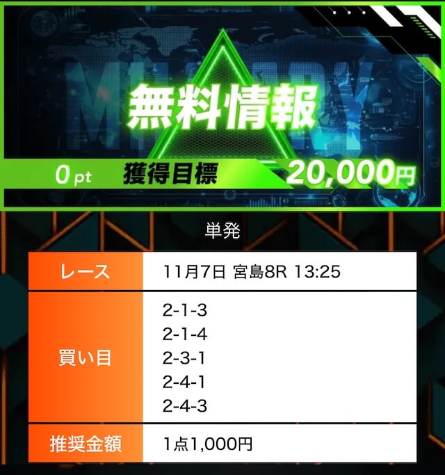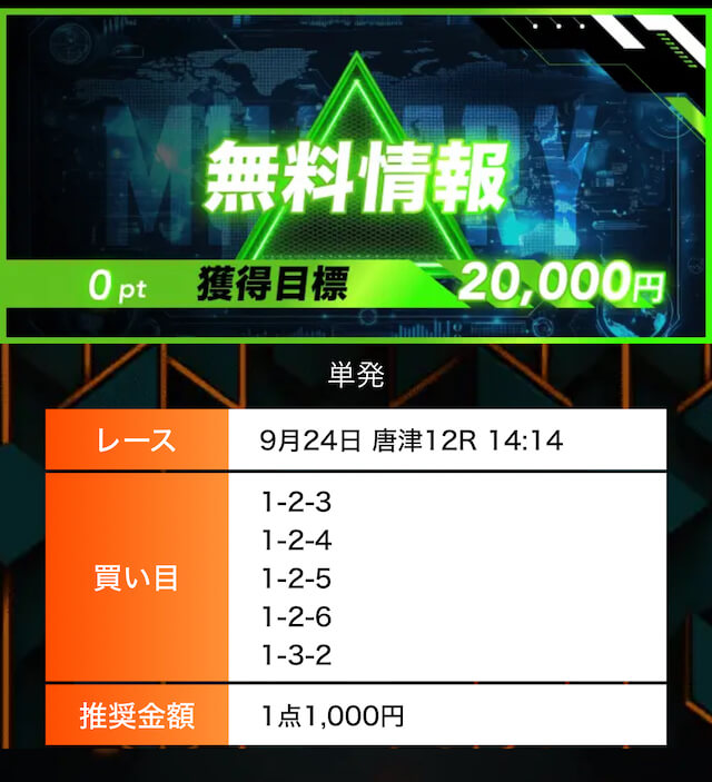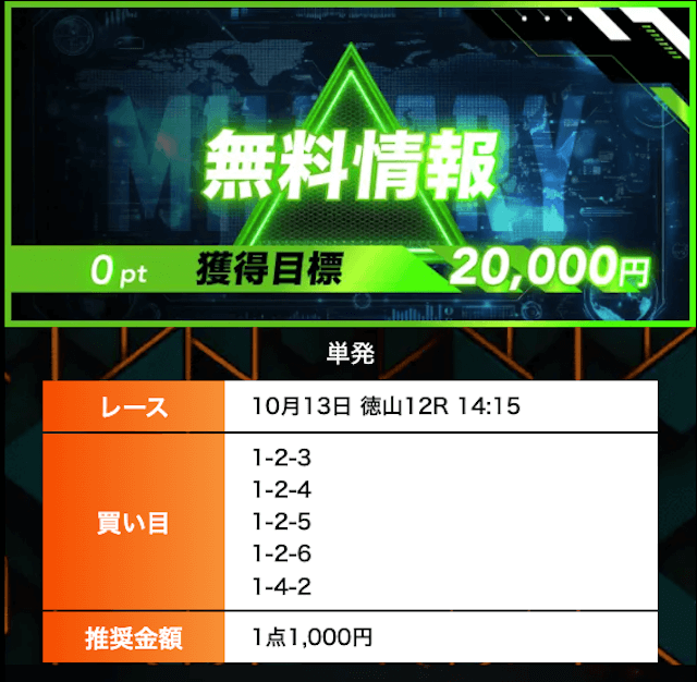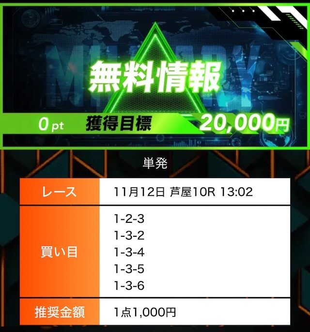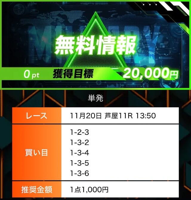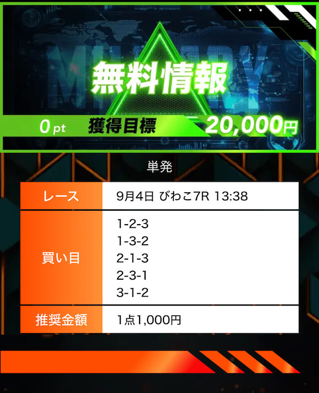 - 有料プランってどこも高い印象だったけど、ここは比較的リーズナブル。特に「登録特典」で参加できる新兵は実質無料みたいなもんでありがたかった。結果はしっかりと的中し4万円ちょっとを獲得できました〜。ぜひお試しあれ!投稿日:2025/09/04
