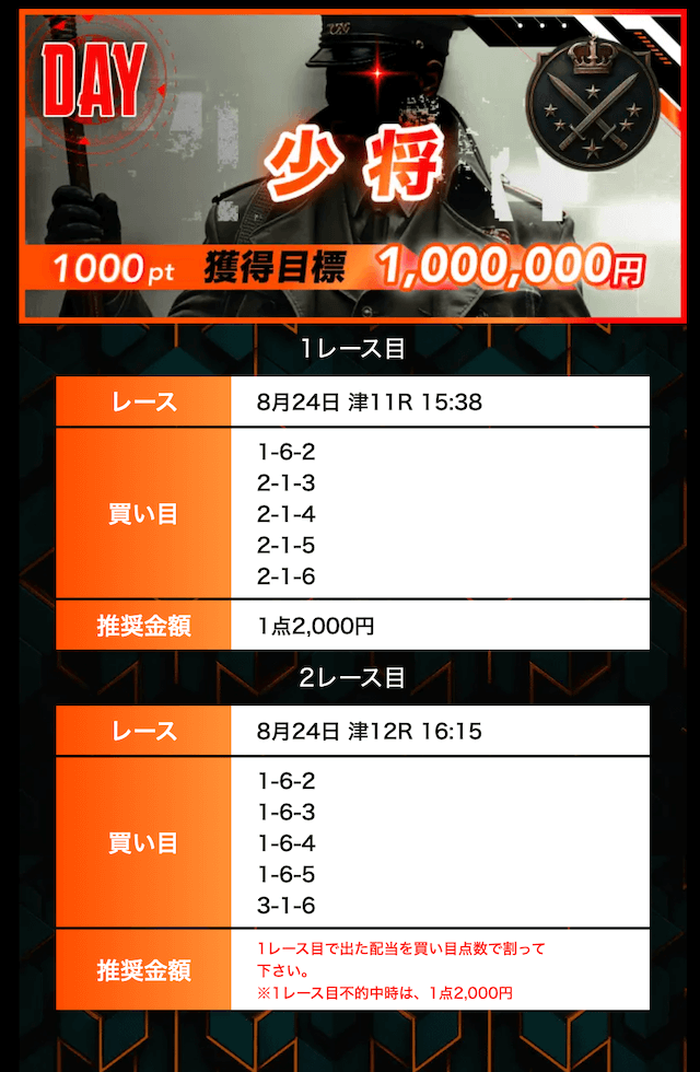 - 試しに奮発して「中将」に参加したけど、残念ながら2戦連続不的中。無料や中堅は良かったのに…ちょっと残念でした・・・。かなりの金額を失ったんじゃないか・・・。投稿日:2025/08/31