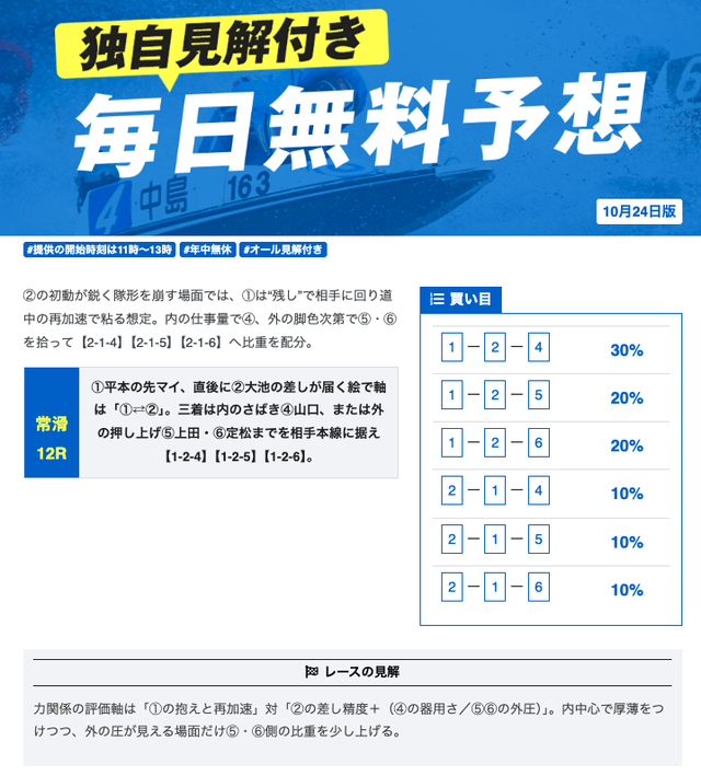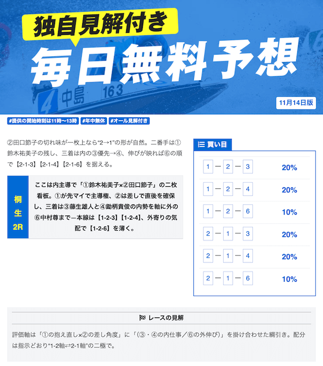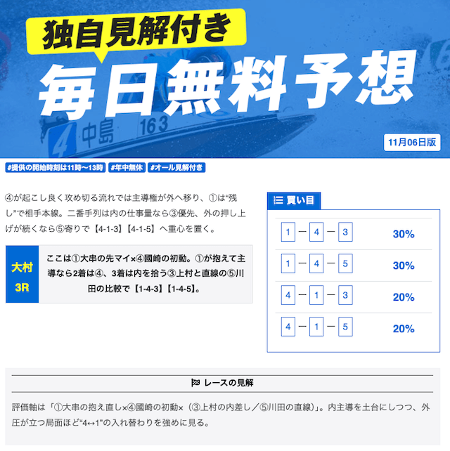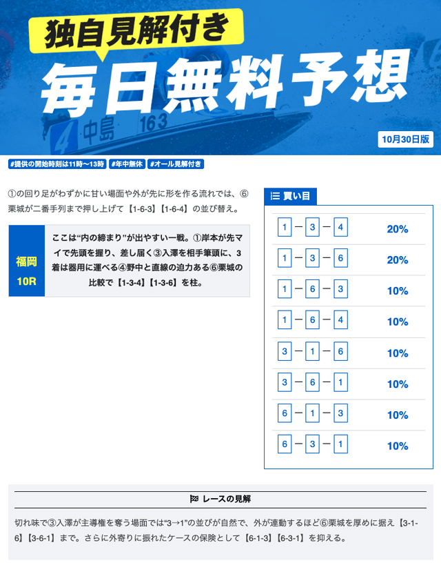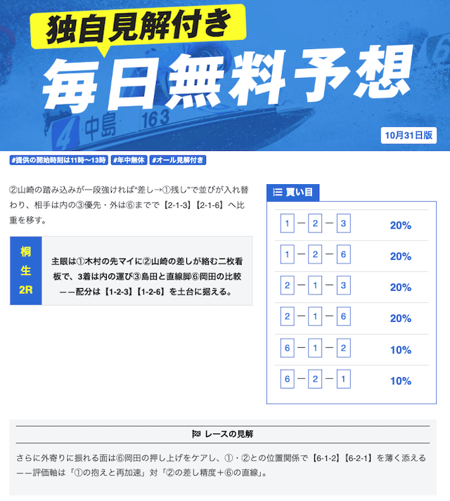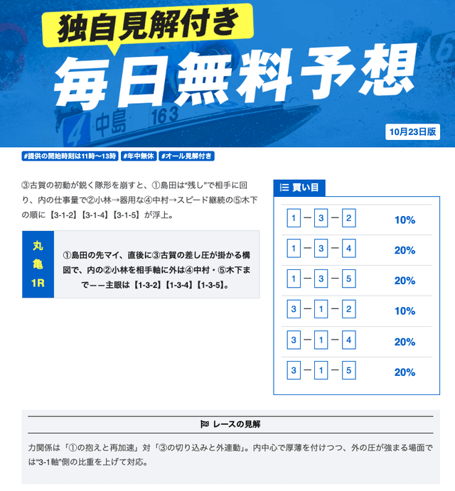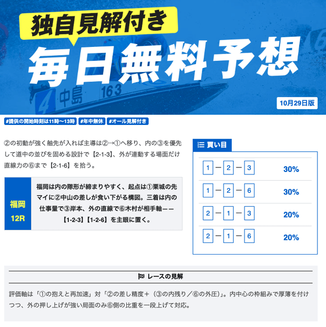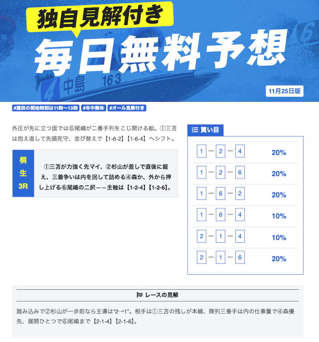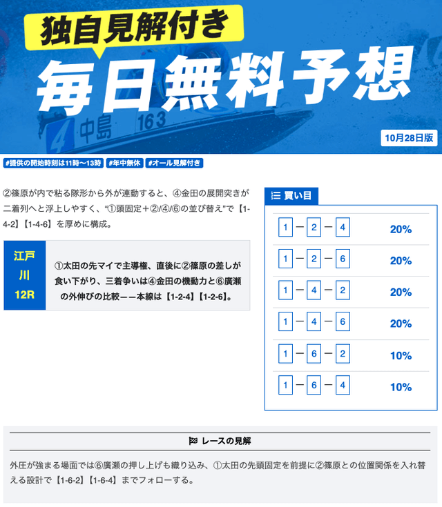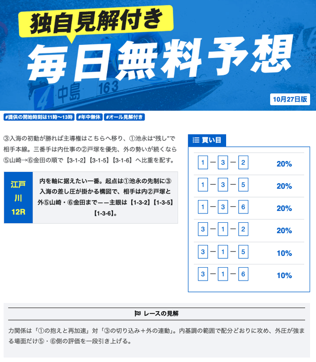 ただ、投資効率という項目が追加されています。有料予想は舟券代に加えて情報料金がかかるので、ユーザーの負担度が考慮されています。※更新頻度は毎日
