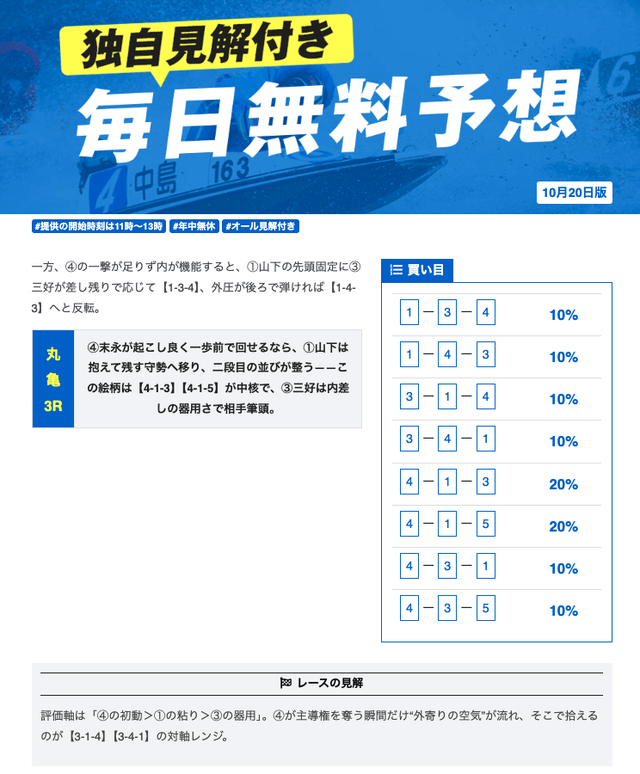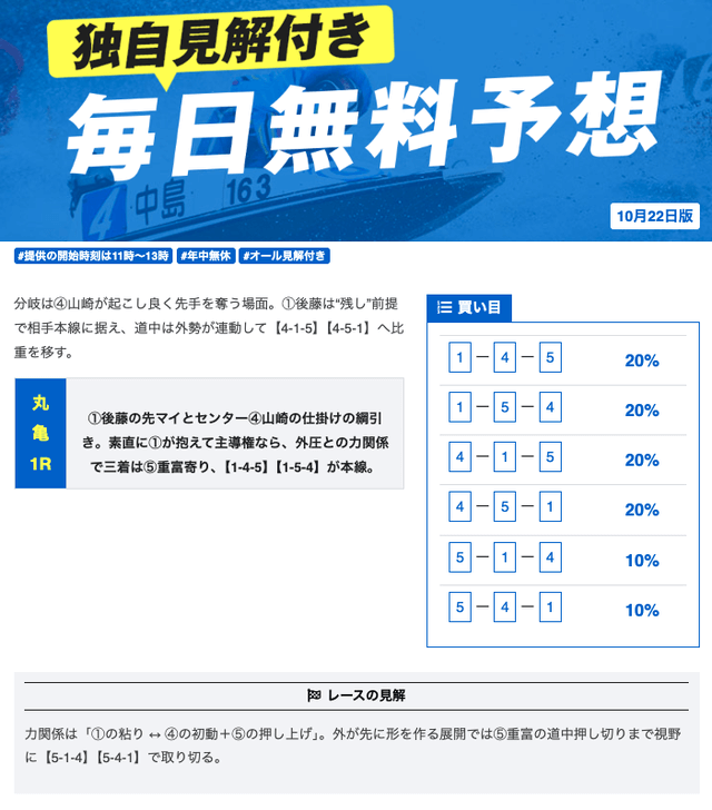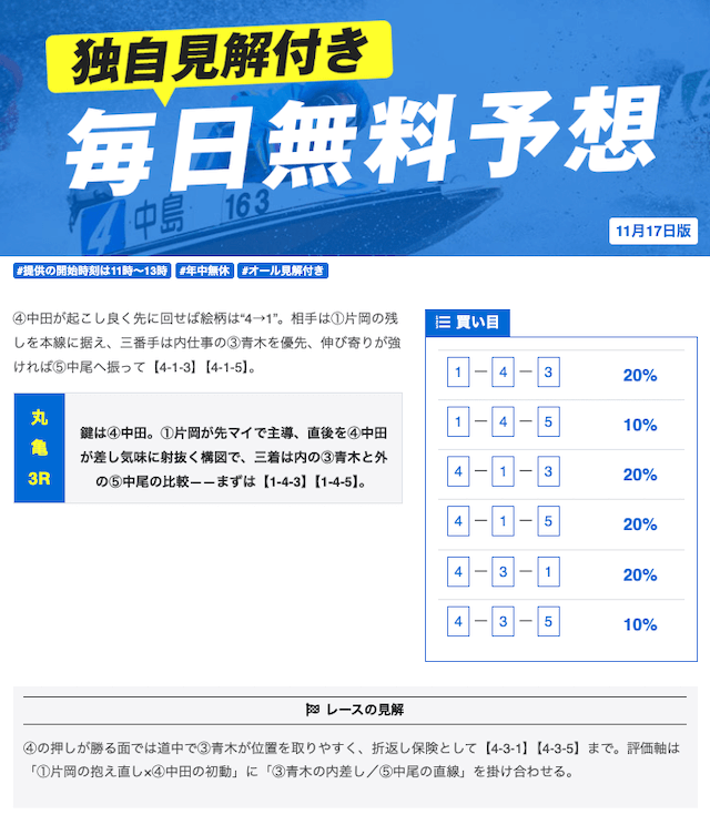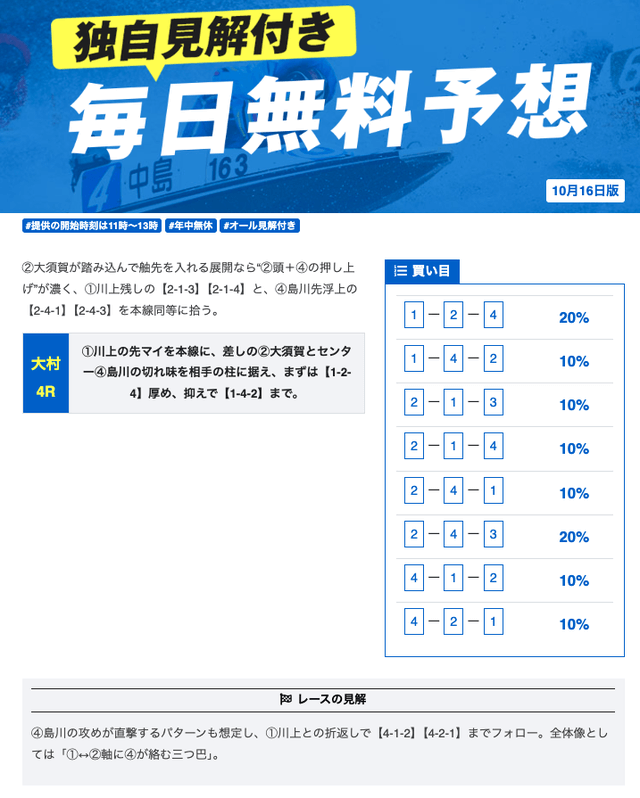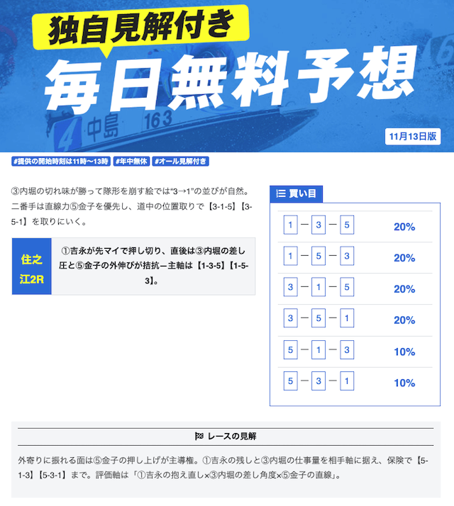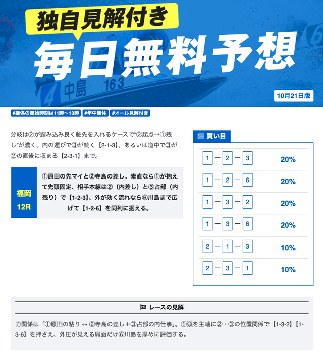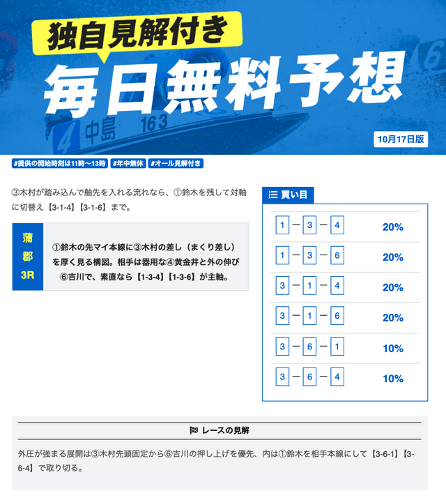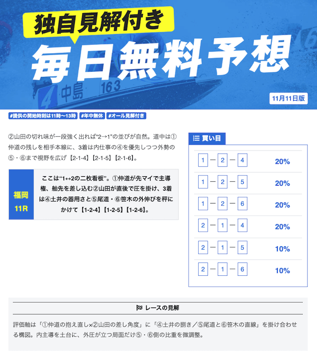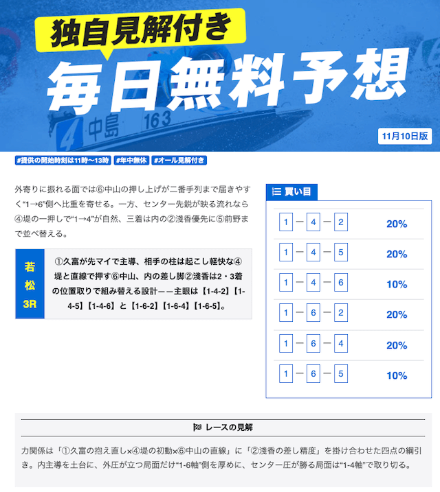 ただ、投資効率という項目が追加されています。有料予想は舟券代に加えて情報料金がかかるので、ユーザーの負担度が考慮されています。※更新頻度は毎日