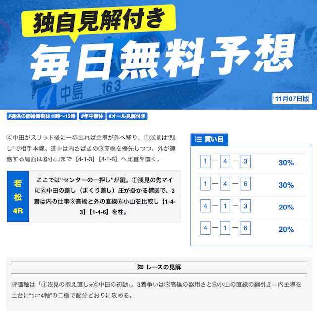 - 競艇予想Novaの無料予想なんだけど。自分は“レース解説の文章”でここ選びました。しっかり理由書いてあって納得感ある。投稿日:2024/11/12