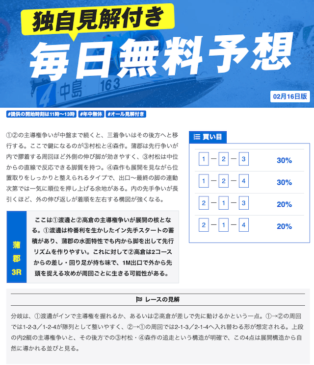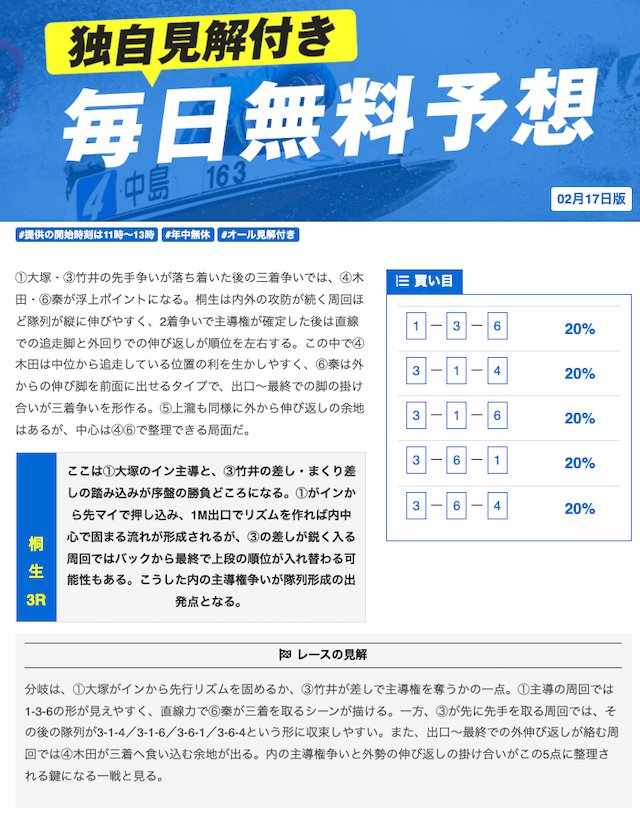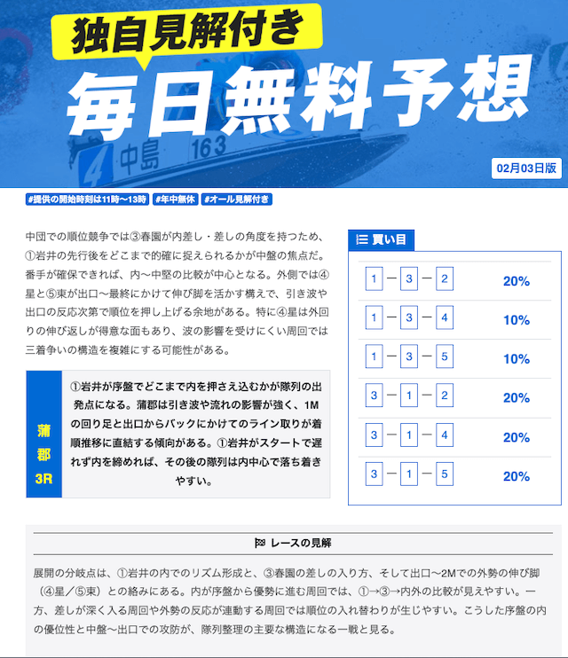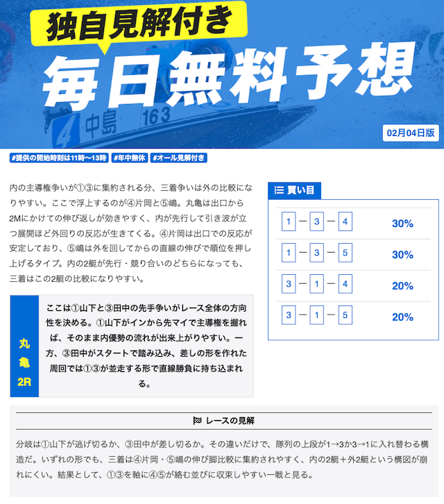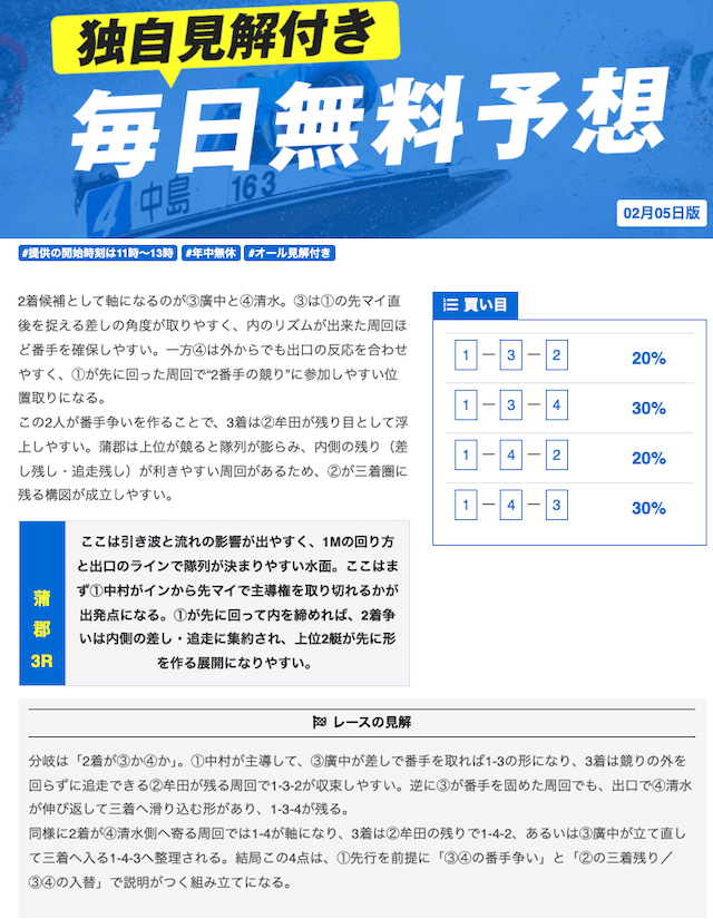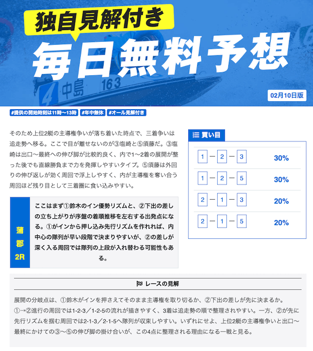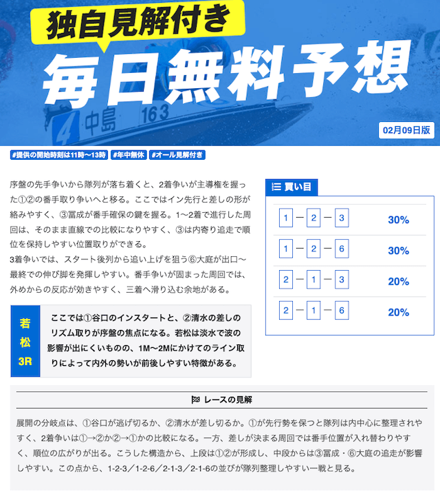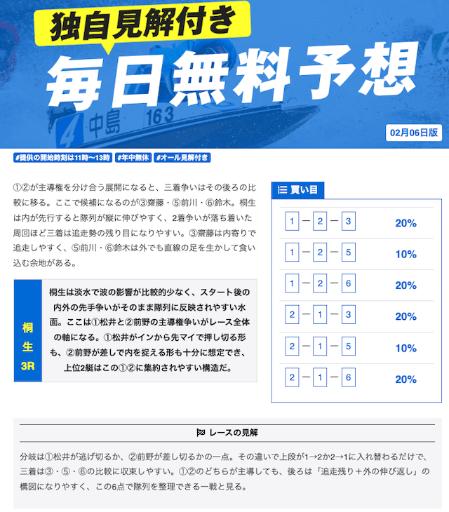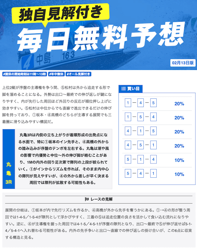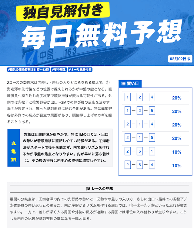 本当に無料予想?ってくらい力入れているな。他の競艇予想サイトの有料予想くらい力入れてる。口コミでの評価も良いし文句なしの競艇予想サイトでしょ。
