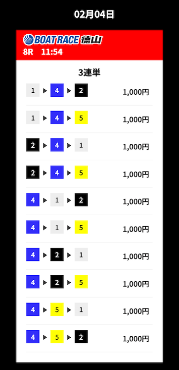 | 12/11 | 徳山8R | 的中 | 16,600円 |  |