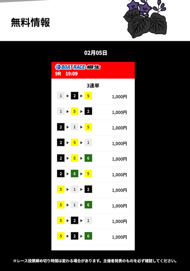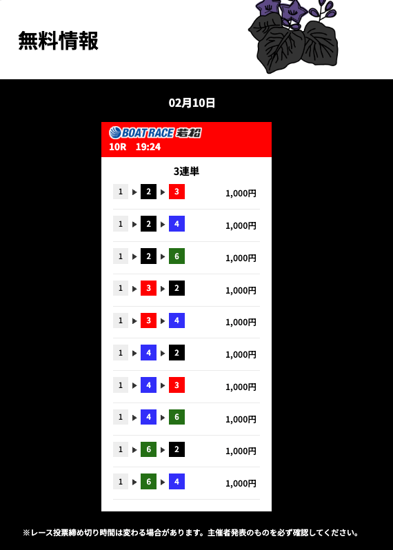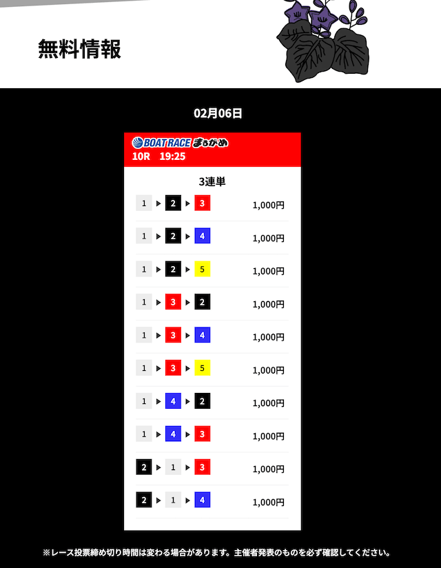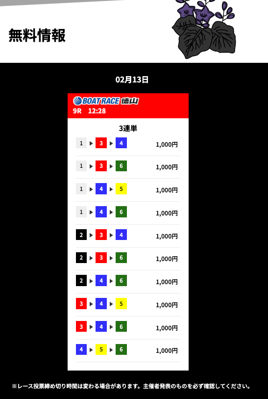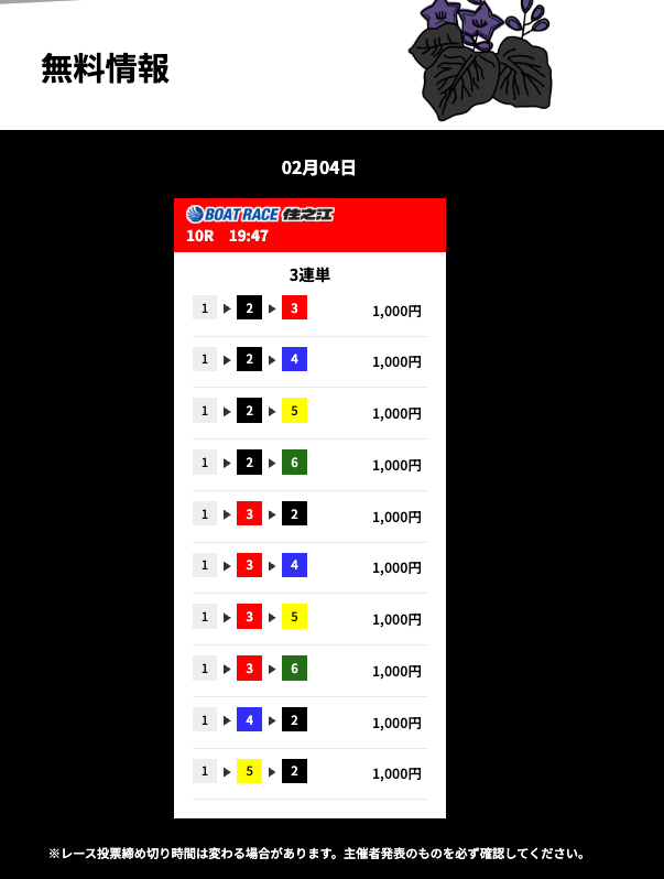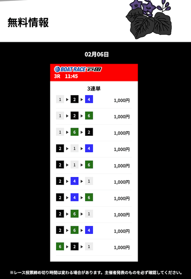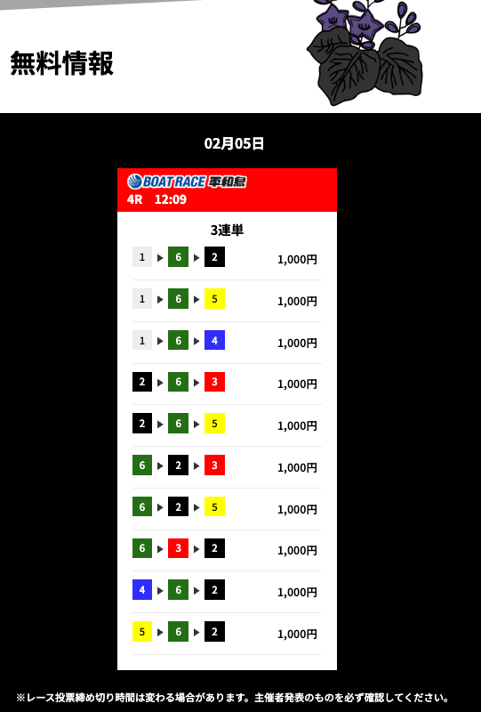 花舟の無料予想は的中率に全振りしているイメージ。半年前から週3程度参加して的中率84%でした。凄すぎませんか??いつでも安心して利用できる花舟の無料予想・・・とにかく信頼しています。これからもよろしくお願いします!