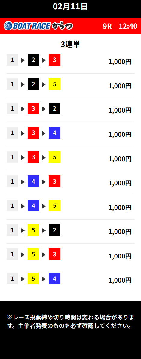 | 12/3 | 唐津9R | 的中 | 11,400円 |  |