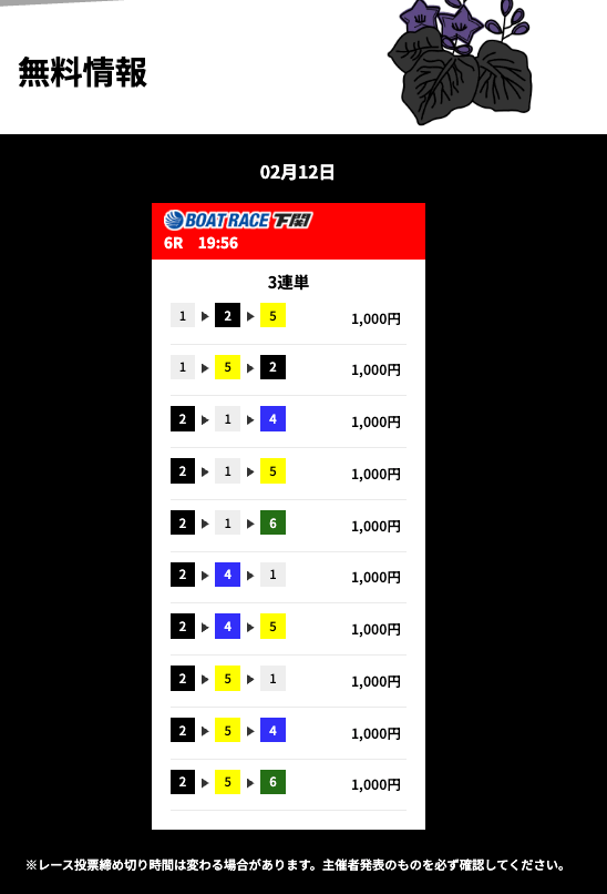 | 12/19 | 下関8R | 的中 | 13,050円 |  |