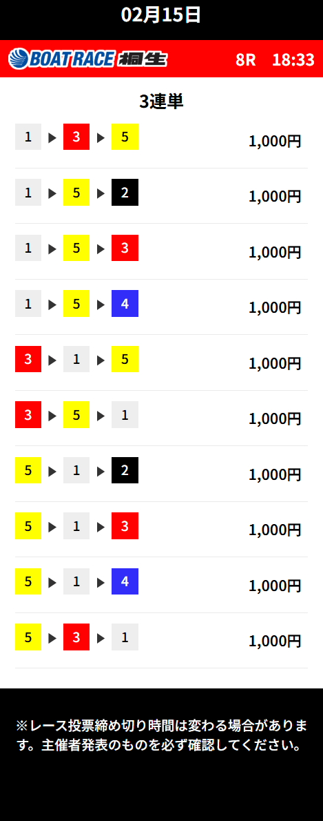 | 11/15 | 宮島5R | 不的中 | 0円 |  |