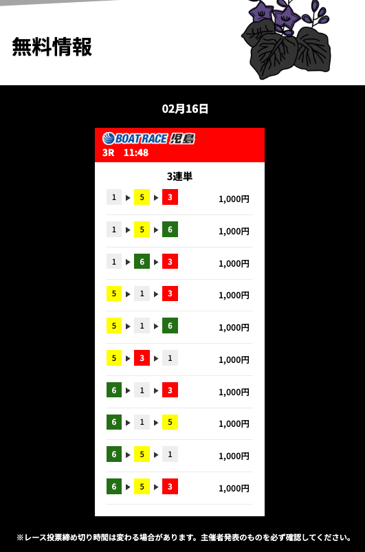 | 11/6 | 宮島6R | 的中 | 52,650円 |  |