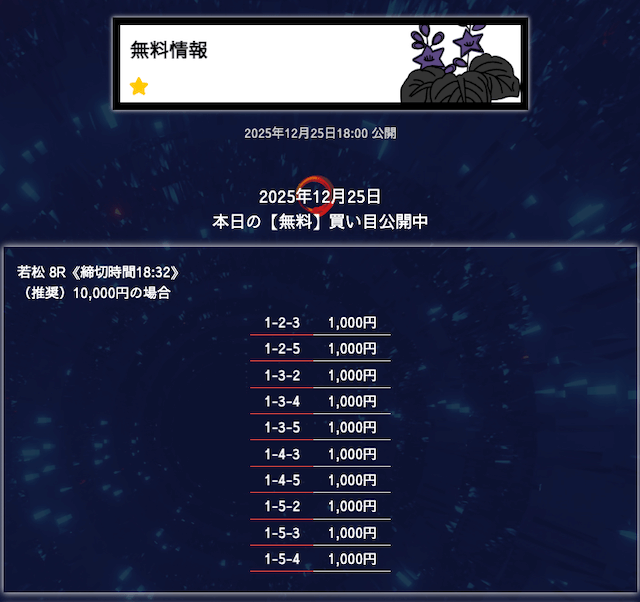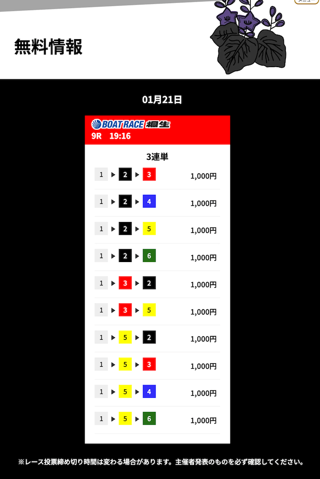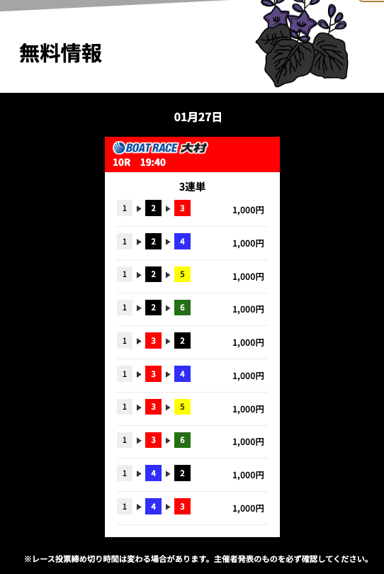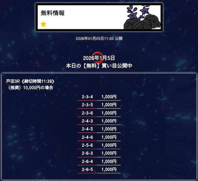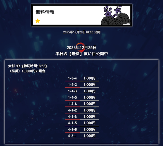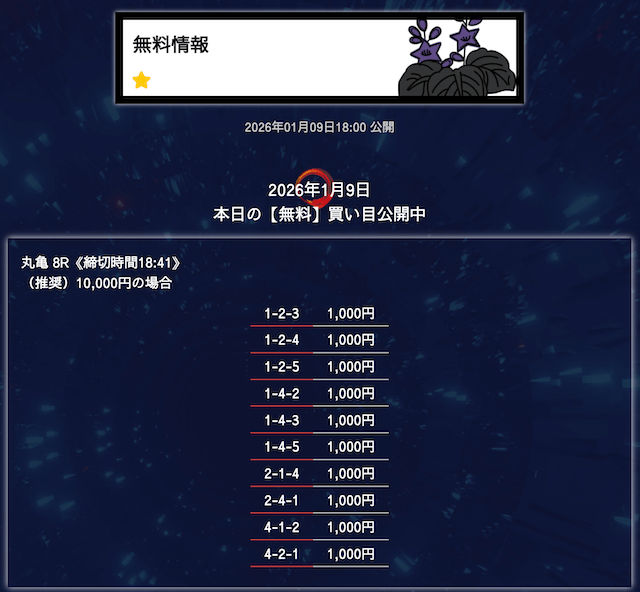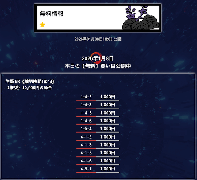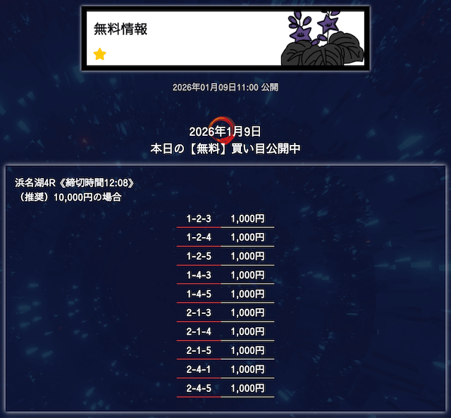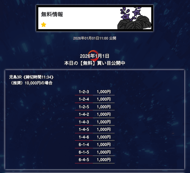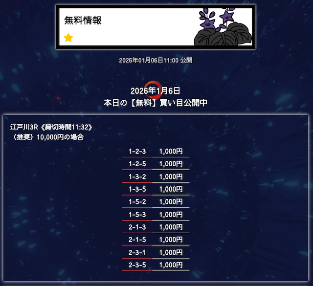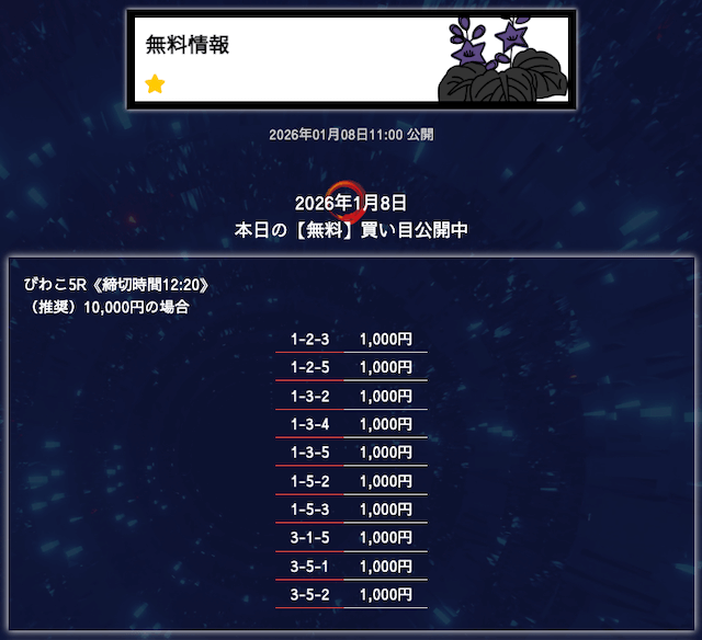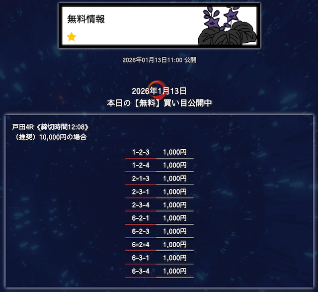 有料予想に参加する際は、登録特典の1万円分のポイントを使うのを忘れずにな。