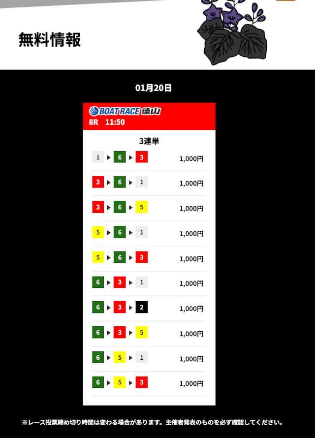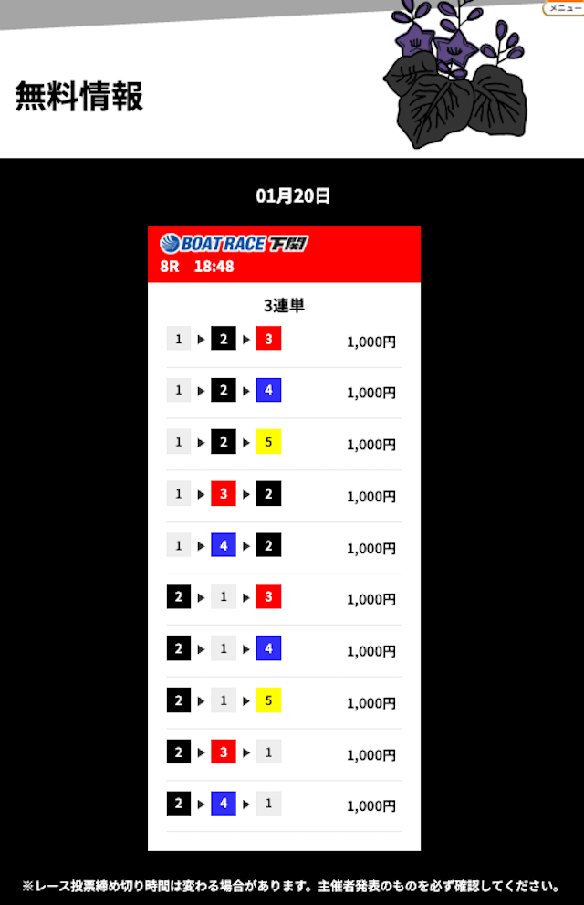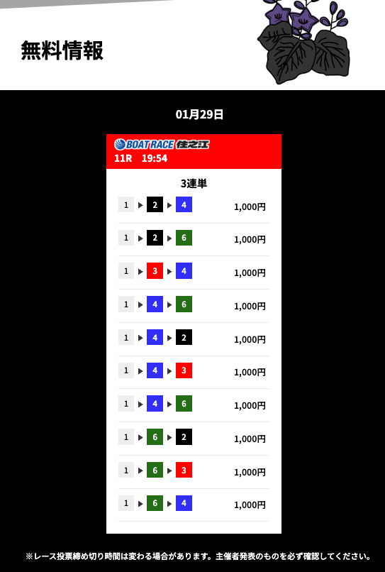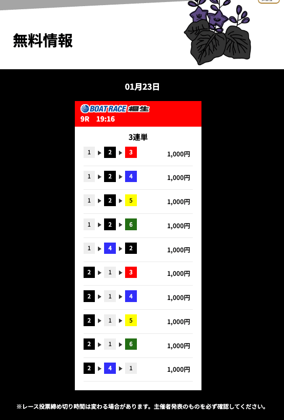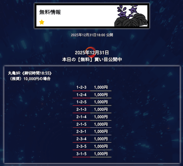 • 舟券代が1万円のため1回の不的中のリスクが大きい(無料予想)