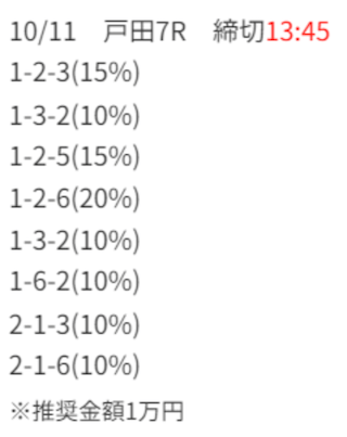 それでは、2024年10月11日の買い目から見ていきましょう。