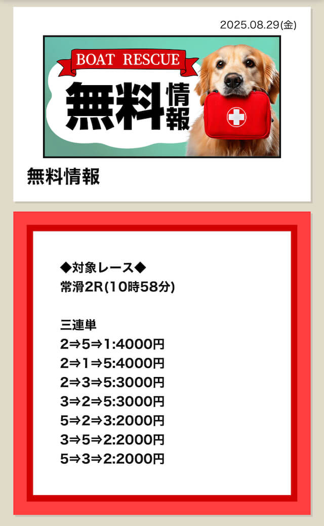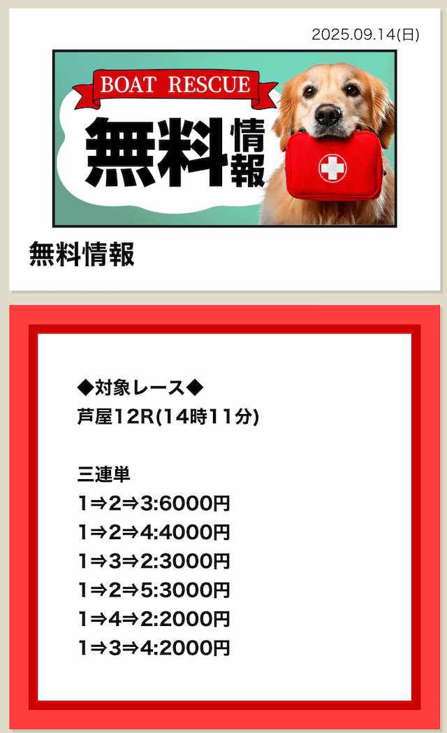25日の無料も芦屋レースで4万6千円の払戻し 23日、24日だけでなく週末から毎日無料情報が当ててくれていいですね投稿日:2025/08/26
