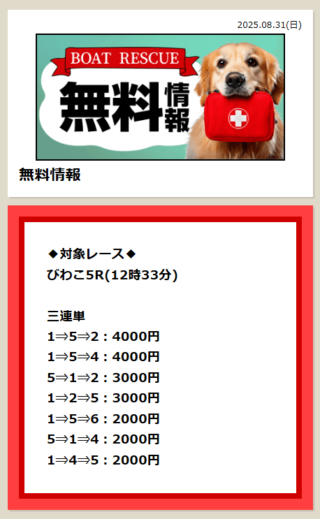 どのレースもイン寄りの堅ぇ予想で、結果も10番人気以内に収まっている。それだけ「ボートレスキュー」はレース選びのセンスが抜群ってことだな。