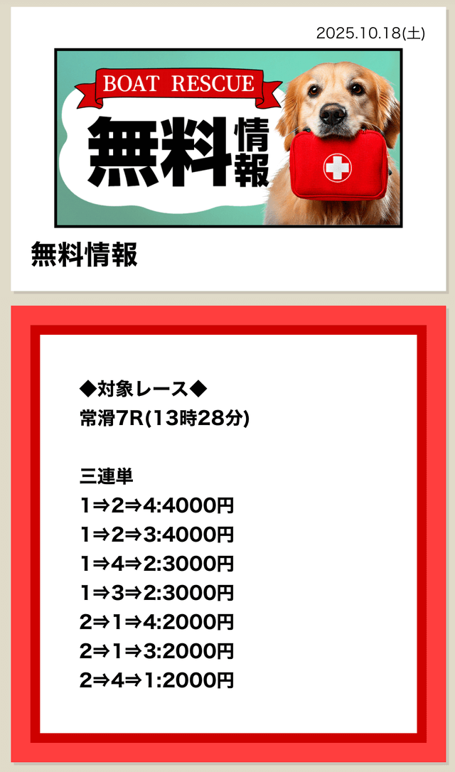 - 人気どころしか狙わないのがちょっとな〜。穴党向けの人にはボートレスキューの無料予想は向かないかも!投稿日:2025/07/12