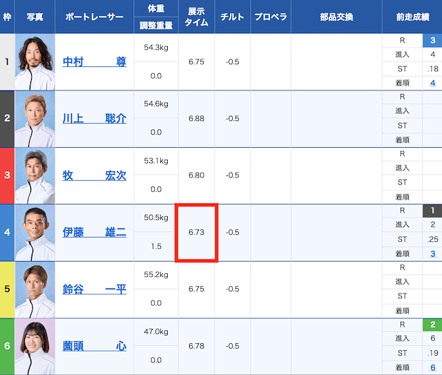 おそらく④の舟足が良いと踏んで、内枠の壁役として、⑤の仕掛けを潰すって見たのだろう。実際、展示タイムも6.73と1位だったぞ。