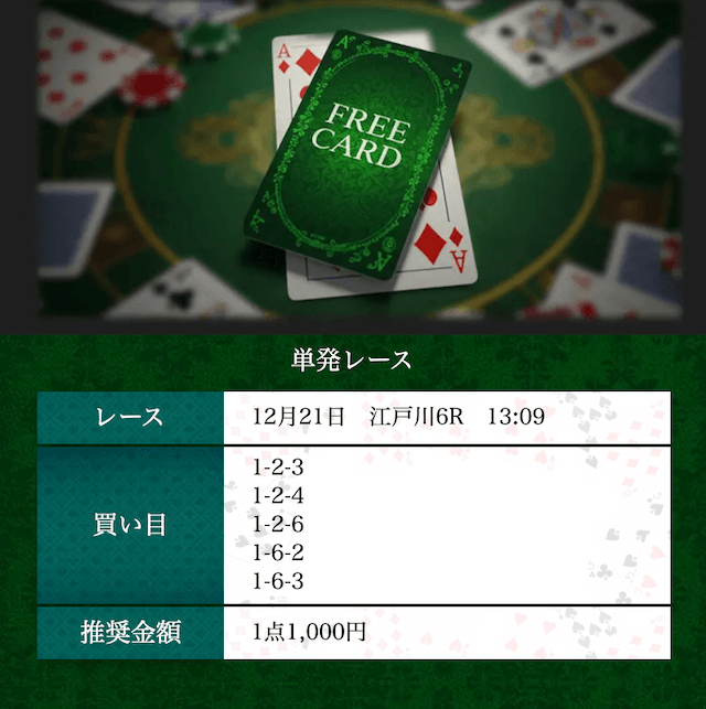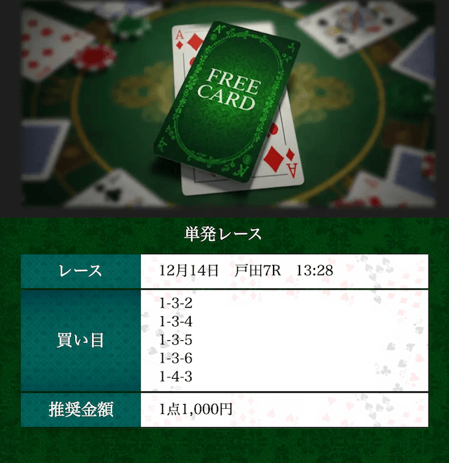 - 無料予想は1日1Rだけど、その分レース選びが的確。無理に数を打たせない姿勢が好印象です〜。投稿日:2025/12/18