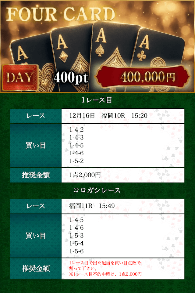 | 2025/12/16 FOUR CARD 情報料金+舟券代 40,000円+10,000円 |