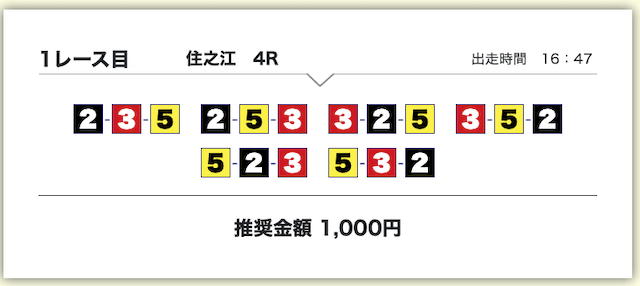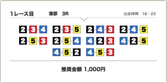それでは、初戦(2023年9月17日)の買い目から見ていきましょう。