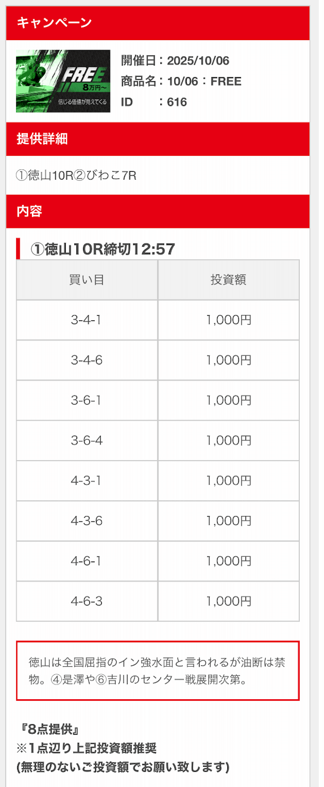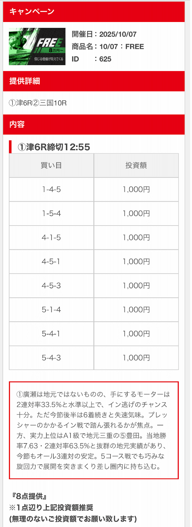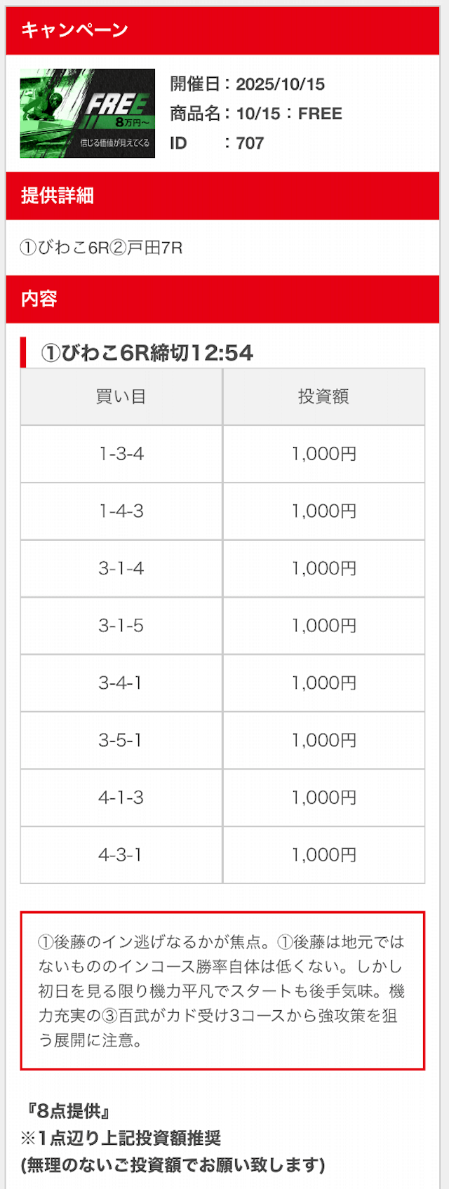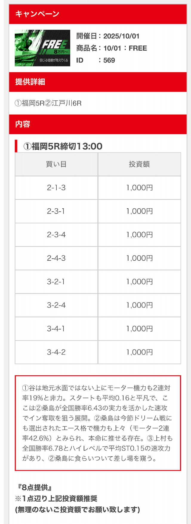 - 無料予想で参加しましたが、資金配分がうまくいかず思ったほど利益が残りませんでした。タイミングによって差が出るかもしれません。投稿日:2025/09/27