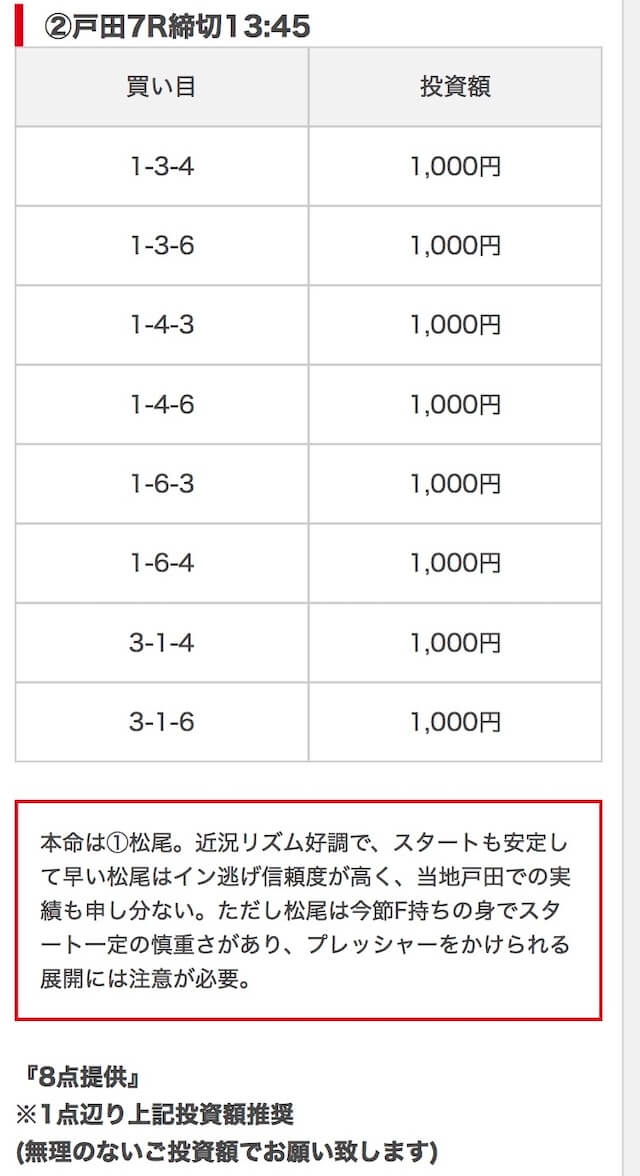 対象は戸田7Rで、買い目は①-③④⑥-③④⑥、③-①-④⑥。