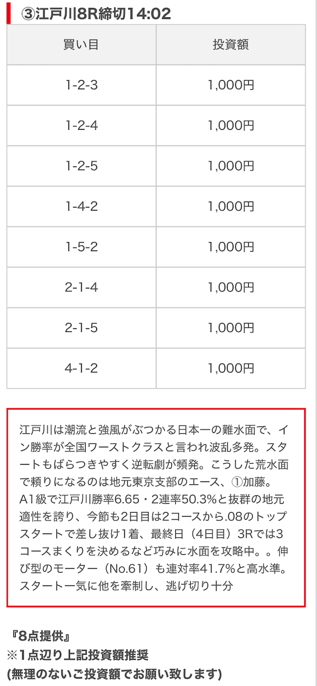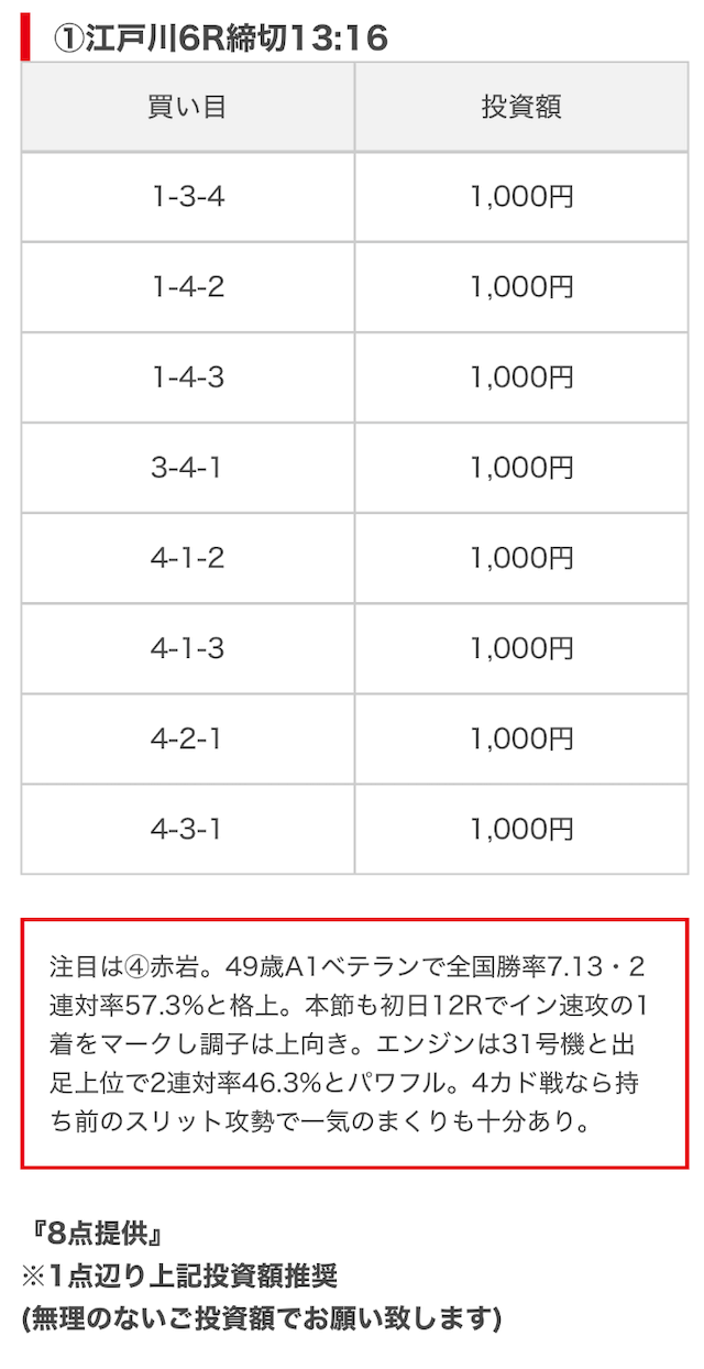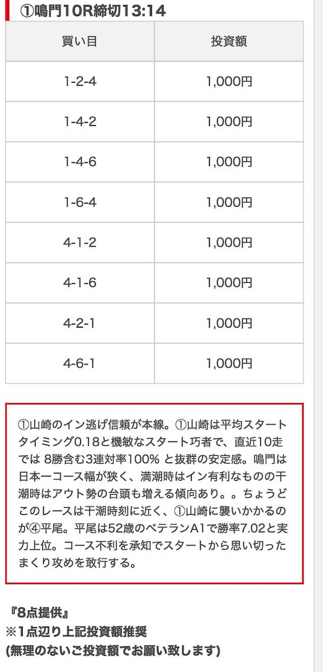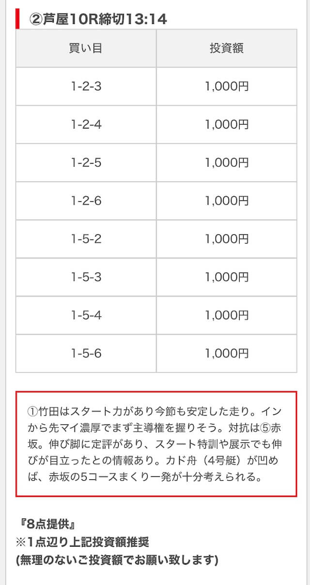 ただ、投資効率という項目が追加されています。有料予想は舟券代に加えて情報料金がかかるので、ユーザーの負担度が考慮されています。※更新頻度は毎日