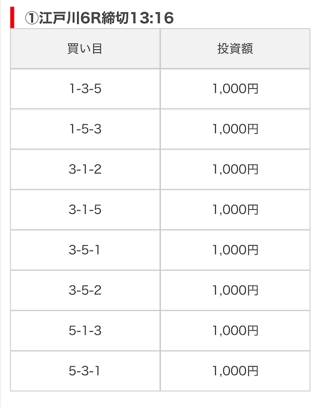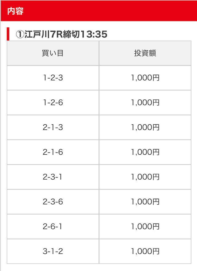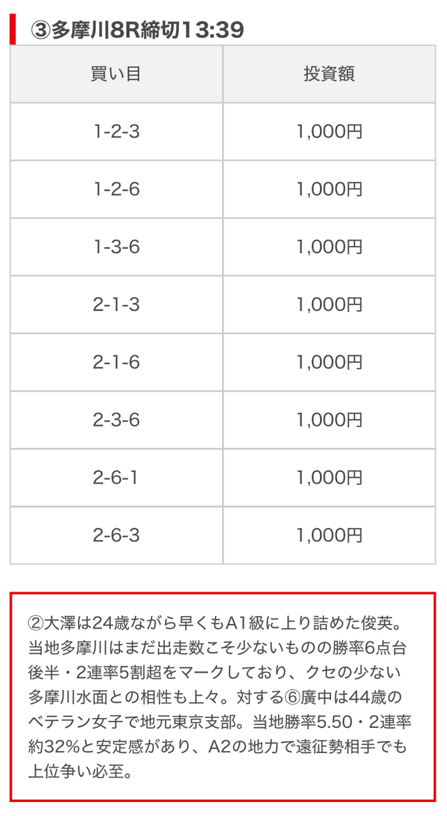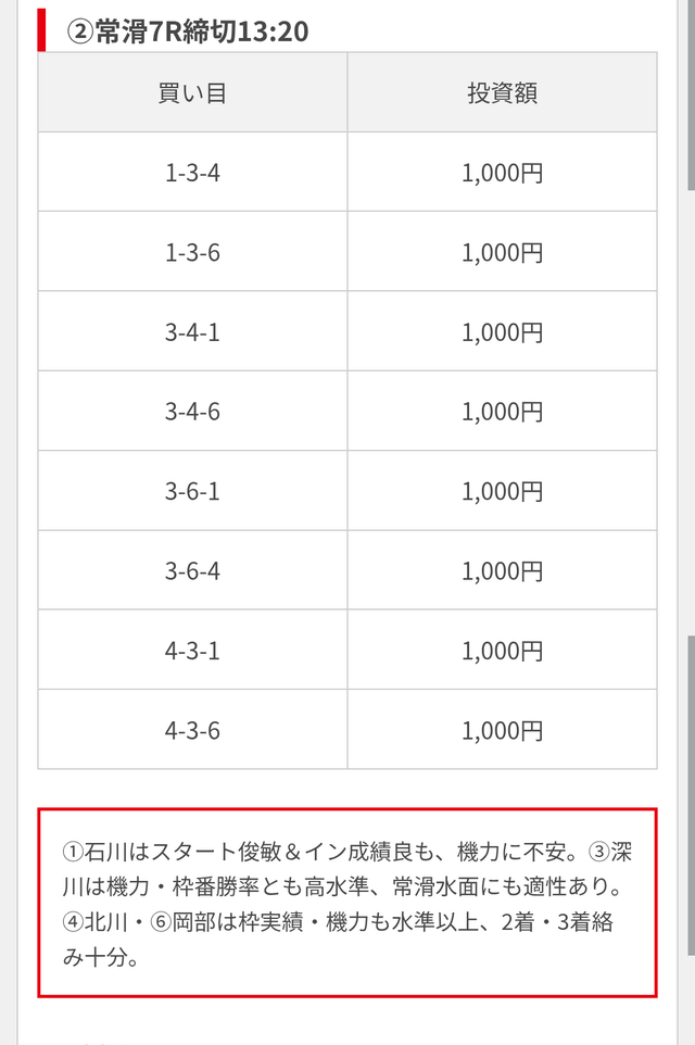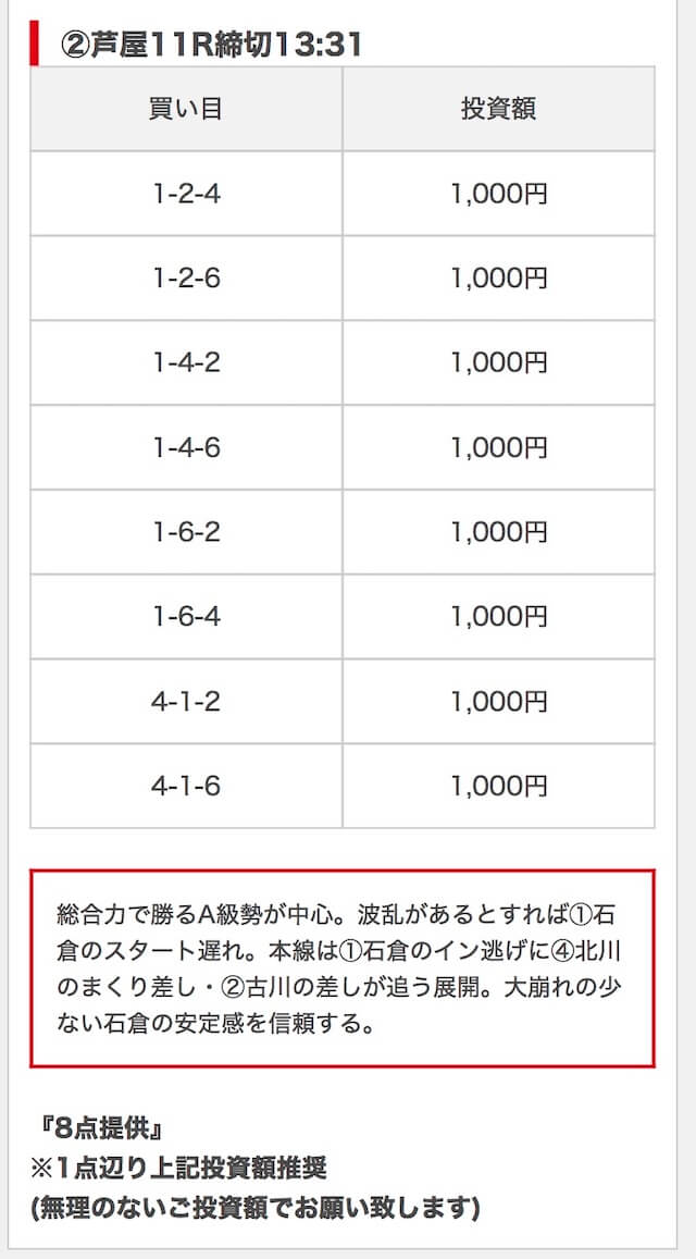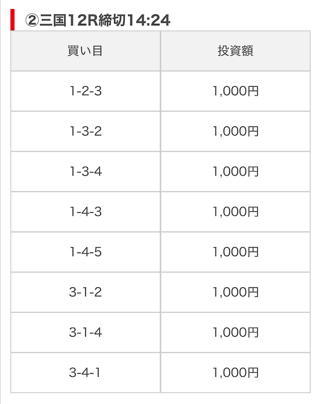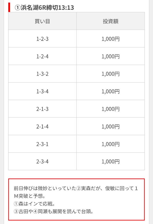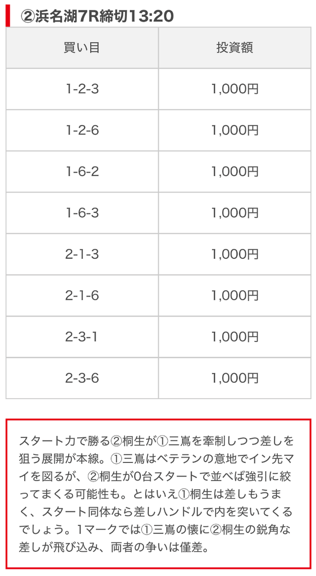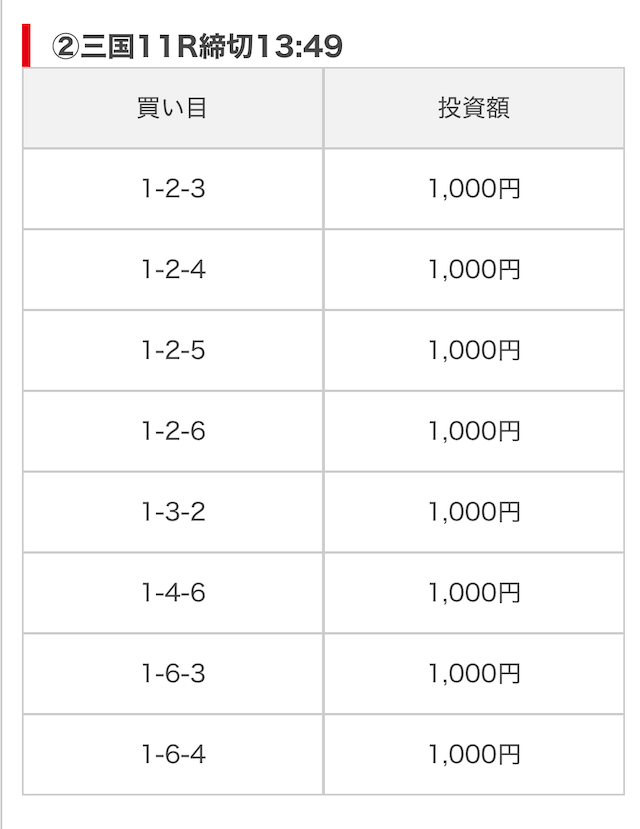 買い目は①-③-②⑥、①-⑥-②③④、②-①-③⑥、②-⑥-①という組み合わせ。