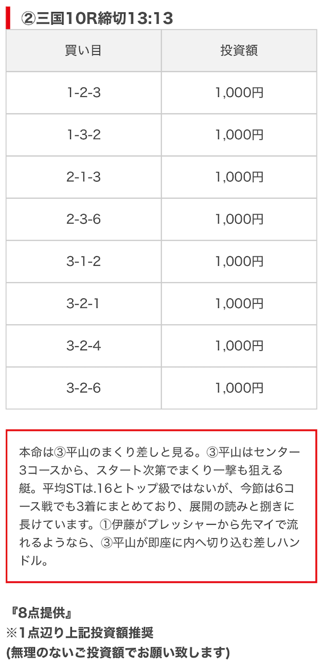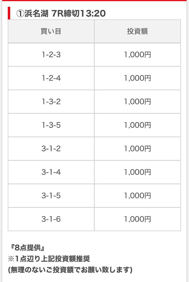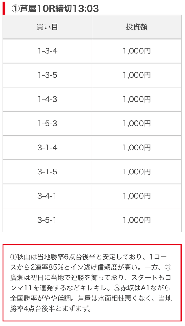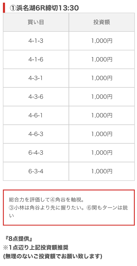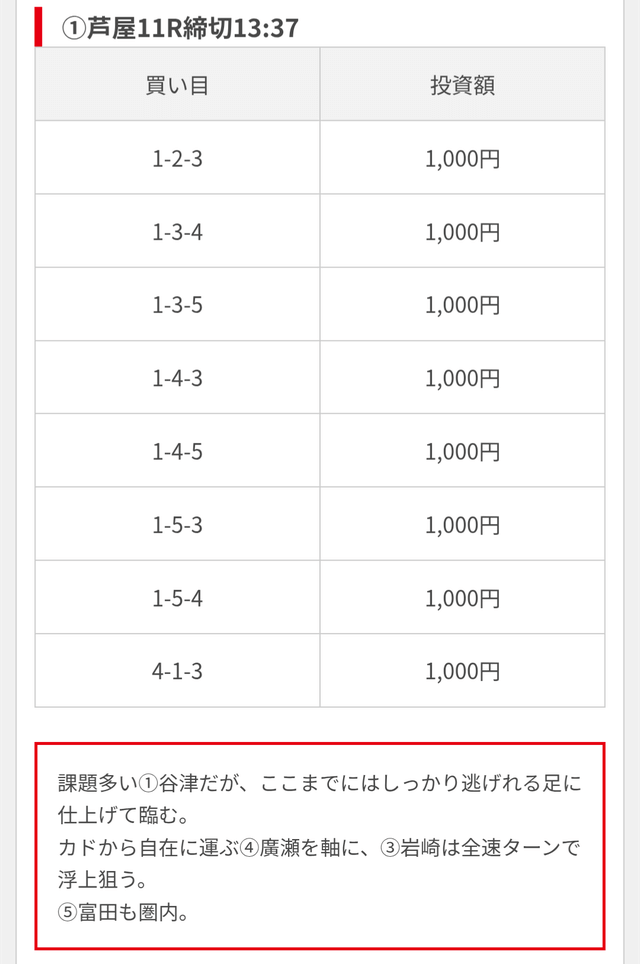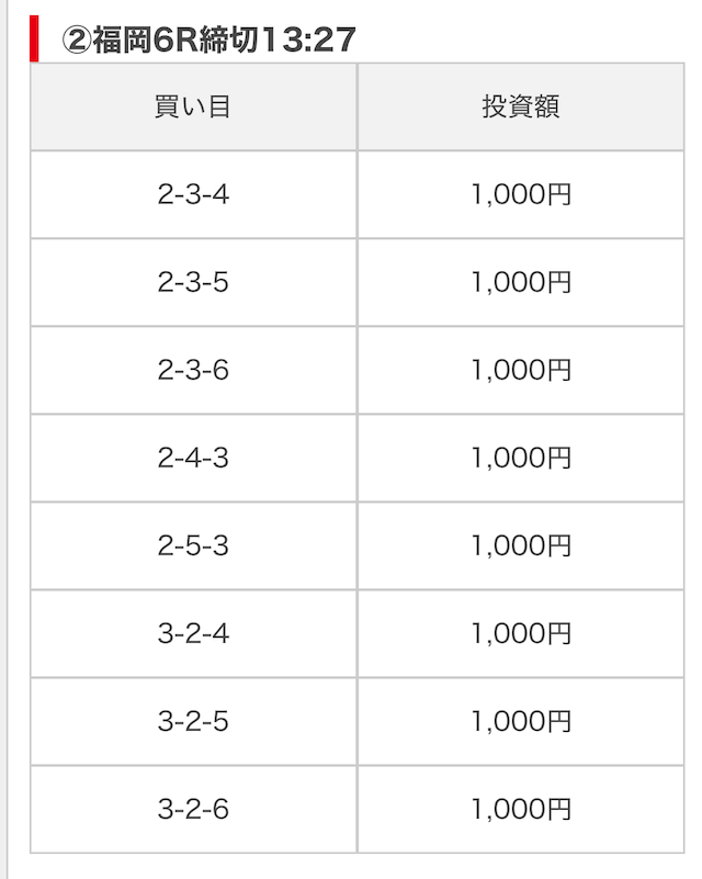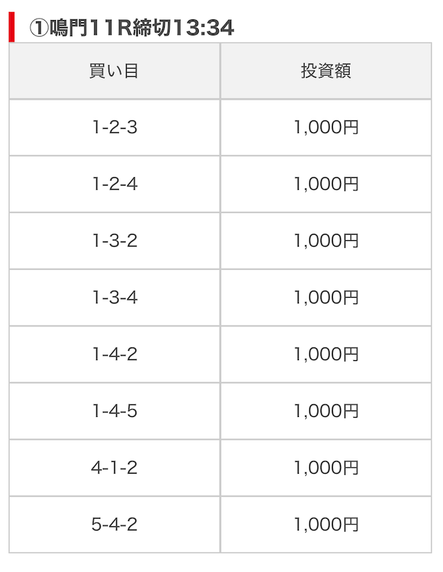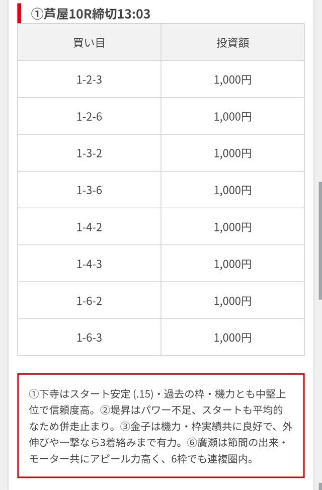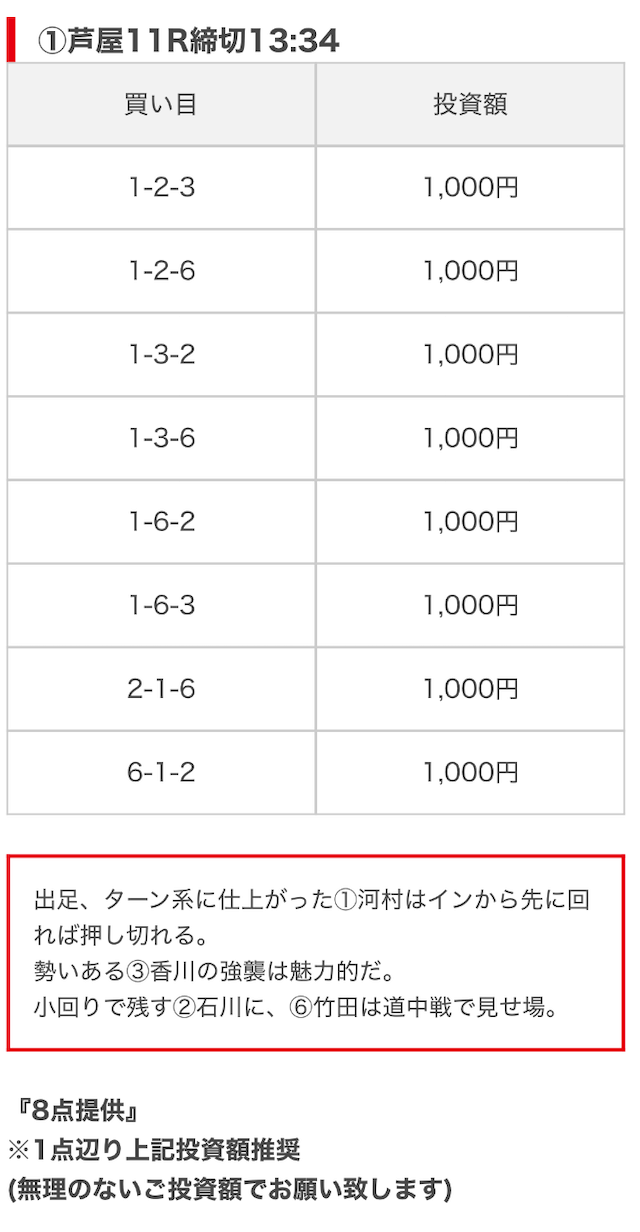 買い目は①-③-②⑥、①-⑥-②③④、②-①-③⑥、②-⑥-①という組み合わせ。
