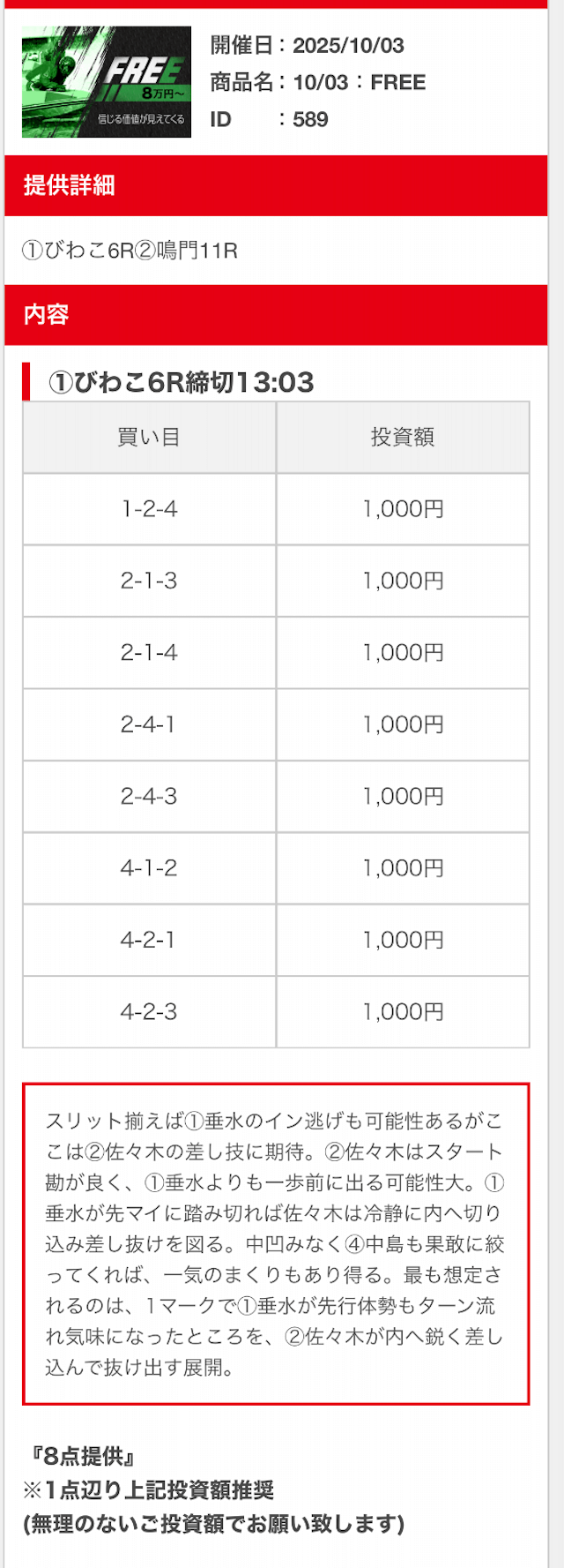 - 無料予想で参加したら、狙った中穴の展開が見事に当たってくれました。オッズはまさかの20倍超え。無料予想とは思えない予想精度に驚いていますww投稿日:2025/09/25
