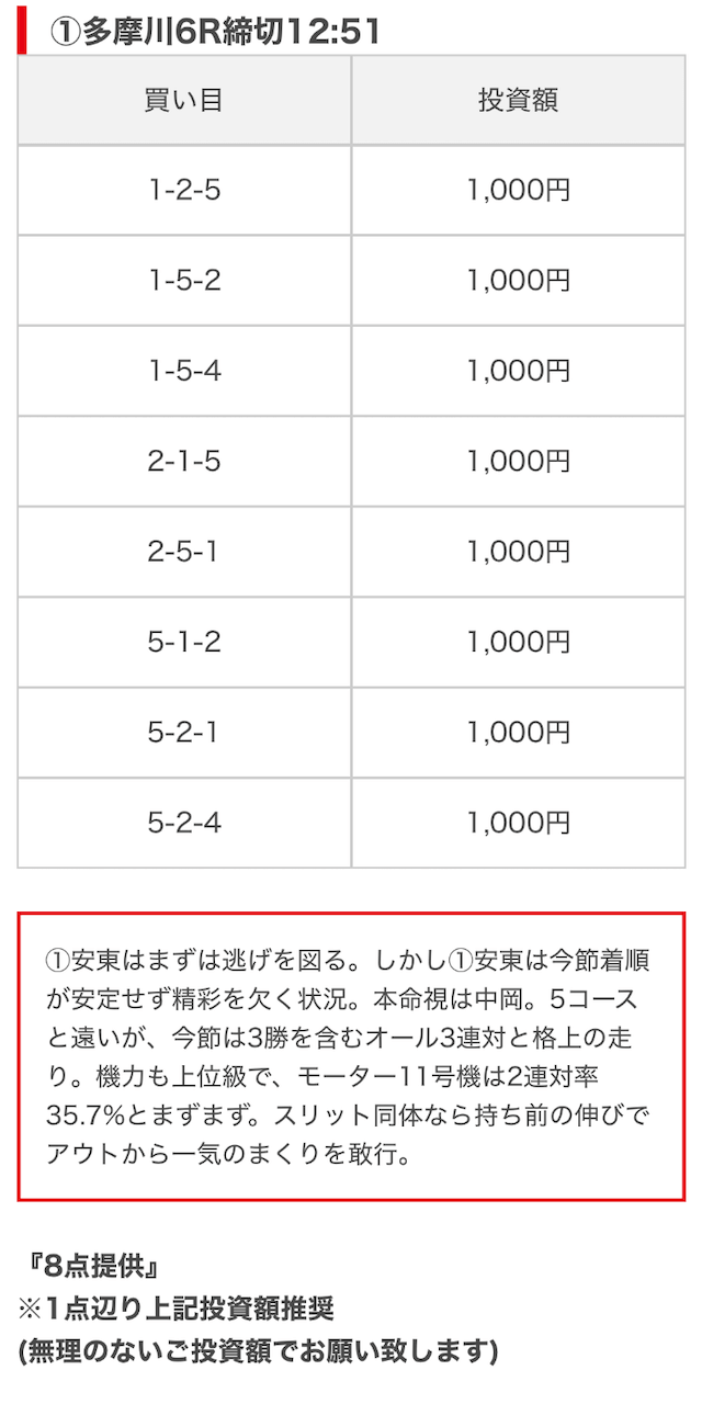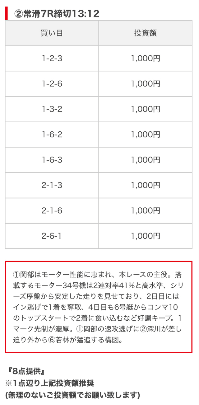 - 無料予想で1点100円から始めてみましたが、2日でプラス5000円。思った以上に現実的に稼げるんだと実感しました。明日から推奨金通りに購入して、バク勝ちしたいと思います。投稿日:2025/09/29