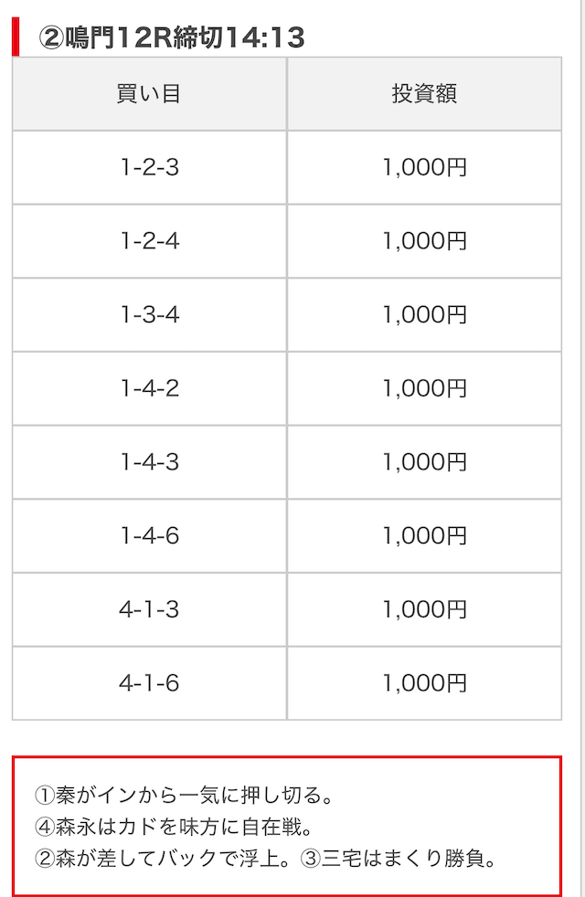 買い目は①-③-④⑥、①-④⑥-③、④-①③-①③、⑥-①③-①③。