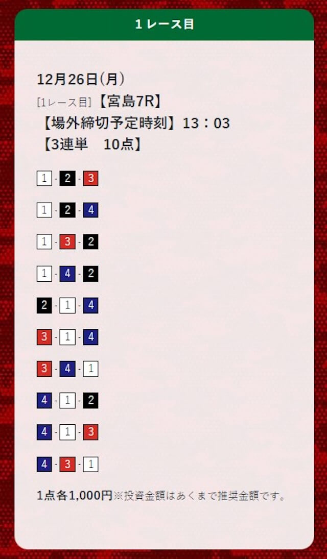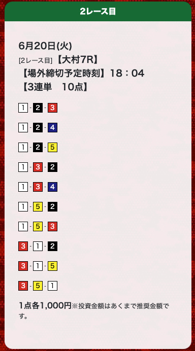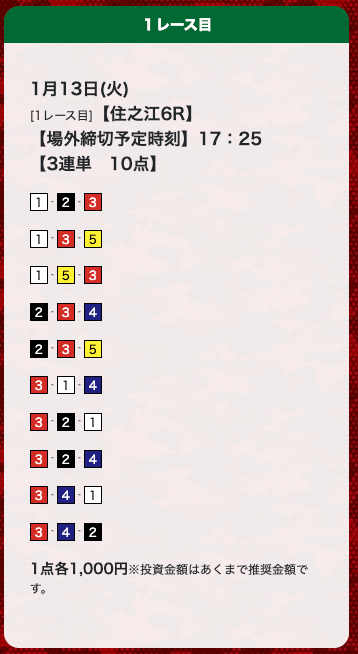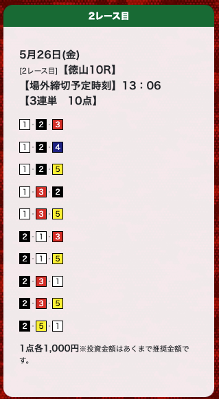 匿名参加したい有料予想の売り切れが早すぎて困ります。仕事終わりに確認するともう買えないことが多く、結局参加できない日が続きました。人気なのは分かるけど、もう少し枠を増やしてほしい。投稿日:2025/08/22