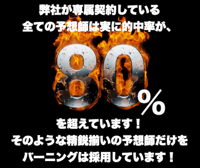 - バーニングの予想すごいな!買い目が多いのはあるんだろうけど、それでも的中率はいように高いと思う。 まだ登録して1週間だけど5回使って5勝!利益も7万円くらいでてて超嬉しい!投稿日:2023/01/11