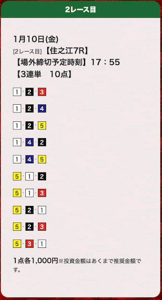 - 公開される無料の予想多くて、しかもバリ当たるから辞めらんない(笑) ナイターでも全然苦戦しないし、今まで不的中続いたこと無いです。今日はちなみに3回的中もらってる。w1レース万舟ついて負けたけど、利益は3万円!!!投稿日:2023/01/10