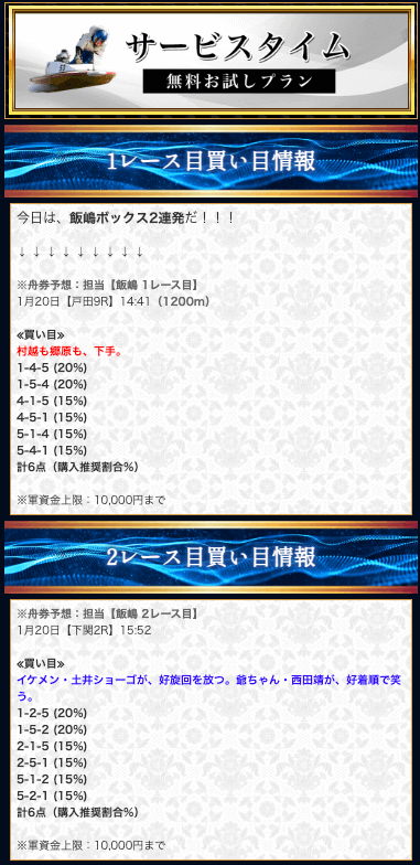 | 2025/1/20 スタンダード 情報料金+舟券代 20,000円+40,000円 |