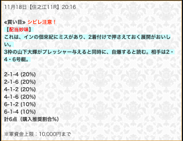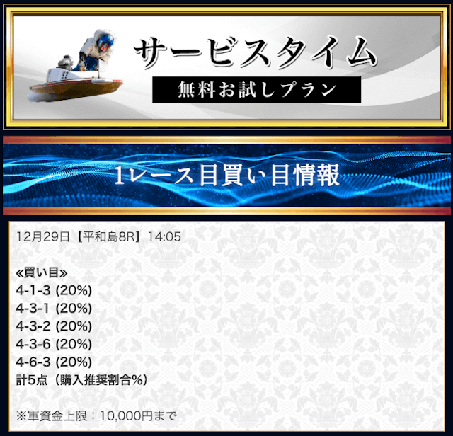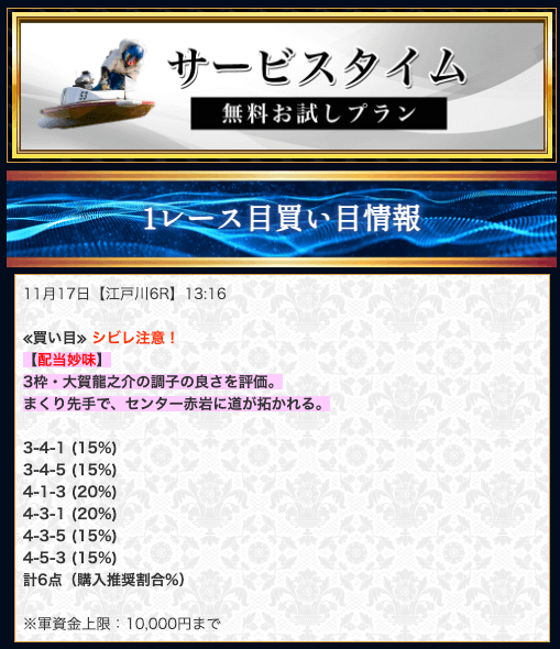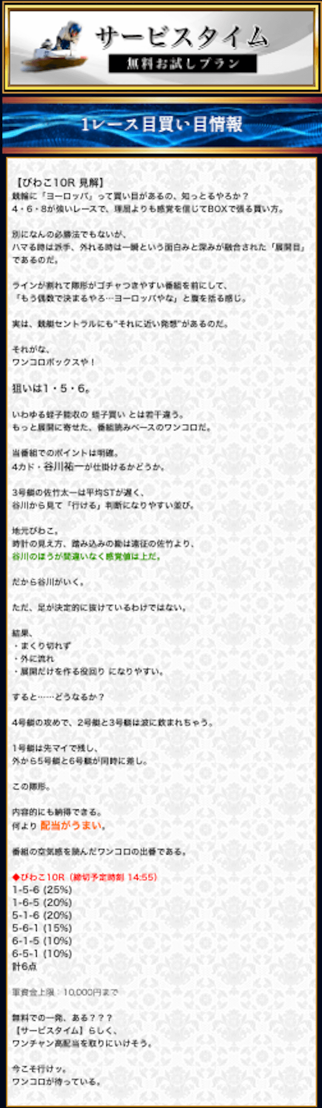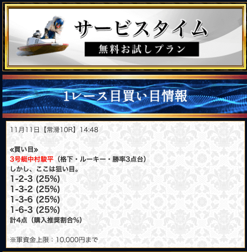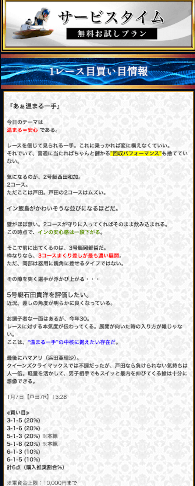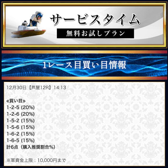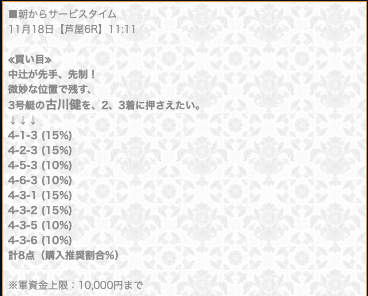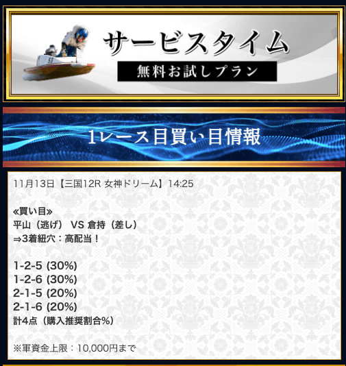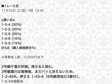 - 無料の精度はイマイチ。だから初有料参加も期待せずにやったら2レース目が当たった。点数4点でピンポイントだったしイケてるかも。+5万円ほどになったので悪くはなかった。ここなら成功させてくれるかもね・・・俺の人生変えてくれるかもね・・・とりま続けてみます。投稿日:2022/11/25